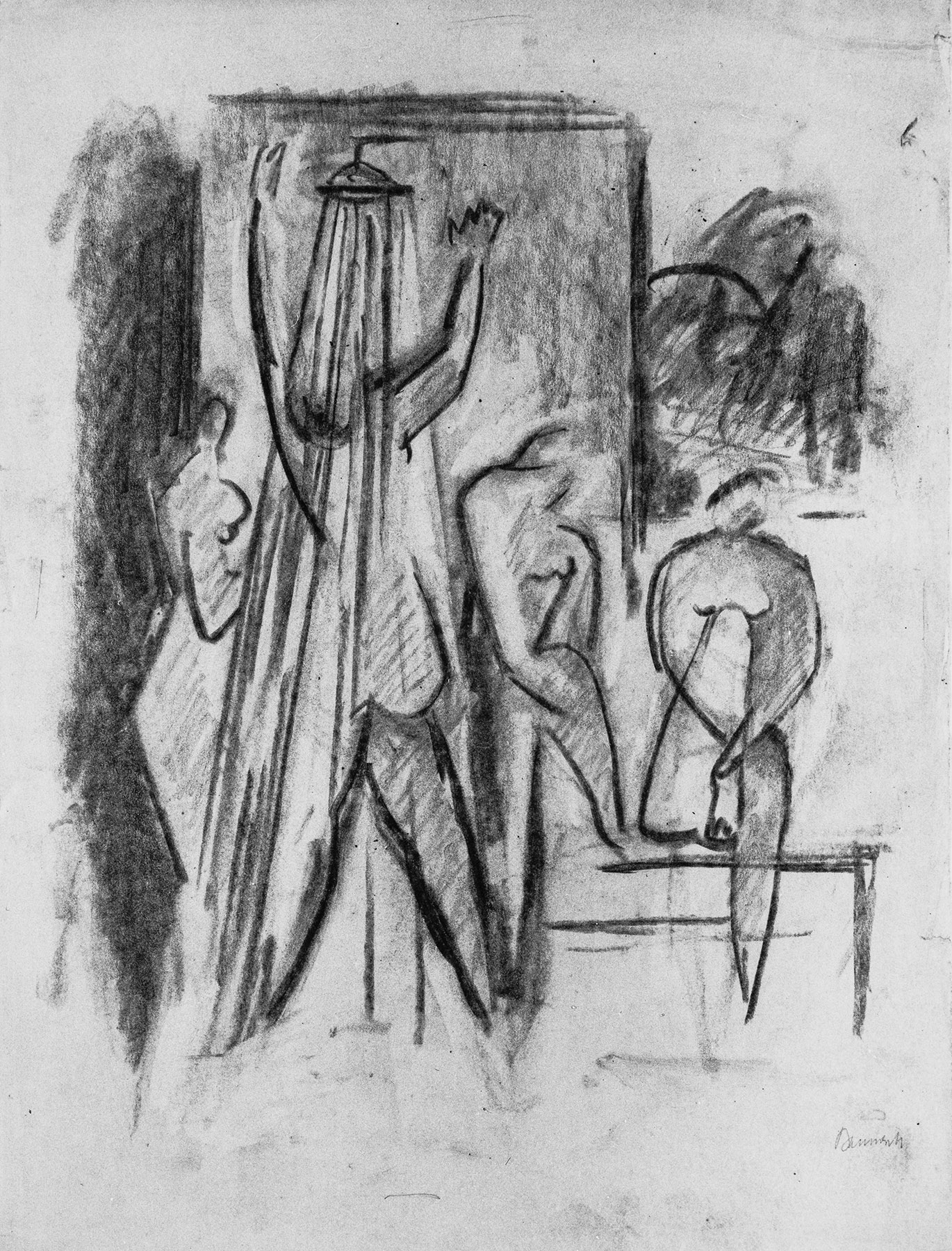 Kohle, z. T. gewischt und radiert, Ölkreide in Orange, Grün, Braun, fixiert, Konturen z. T. blind vorgeritzt, auf chamoisfarbigem, imitiertem Japanpapier