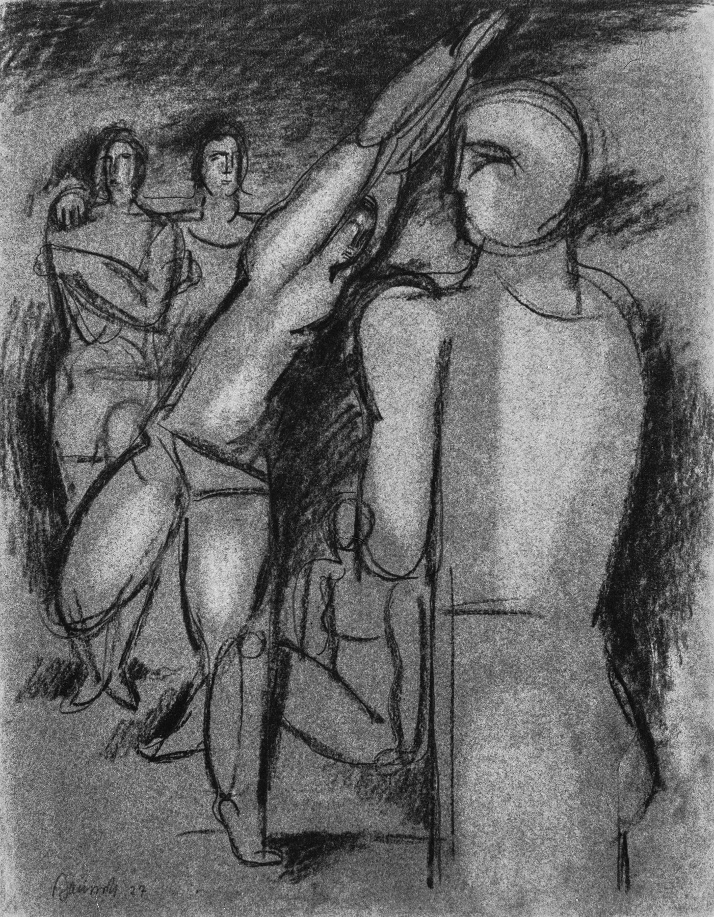 Das auf 1927 datierte Blatt zeigt das Motiv des Hammerwerfers zum ersten Mal. Die große Repoussoir-Figur am rechten Rand ist Formulierungen Oskar Schlemmers verwandt. Vgl. das Gemälde „Springer“, Gräff, Stuttgart 1927, Abb. S. 35. 279-286: Dieses Motiv wurde von B. in der Studie für Holz-Intarsien wieder aufgenommen und variiert, entstanden in Zusammenhang mit seiner Forschung über die Technik der Wandbilder 1941/42, vgl. Dr. Kurt Herberts, Wände und Wandbild, Stuttgart 1953, Abb. S. 263. (fkb)