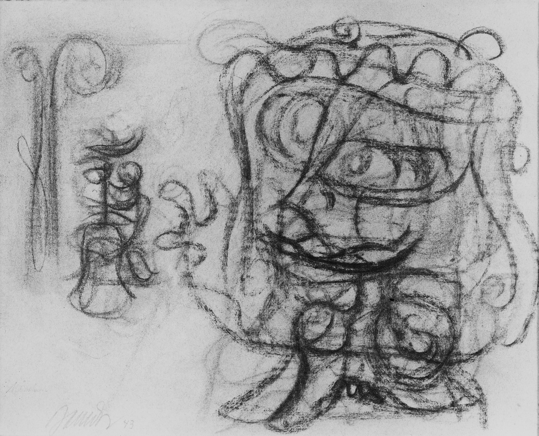 Kohle, auf rosafarbigem Bütten mit rötlichen Fasern