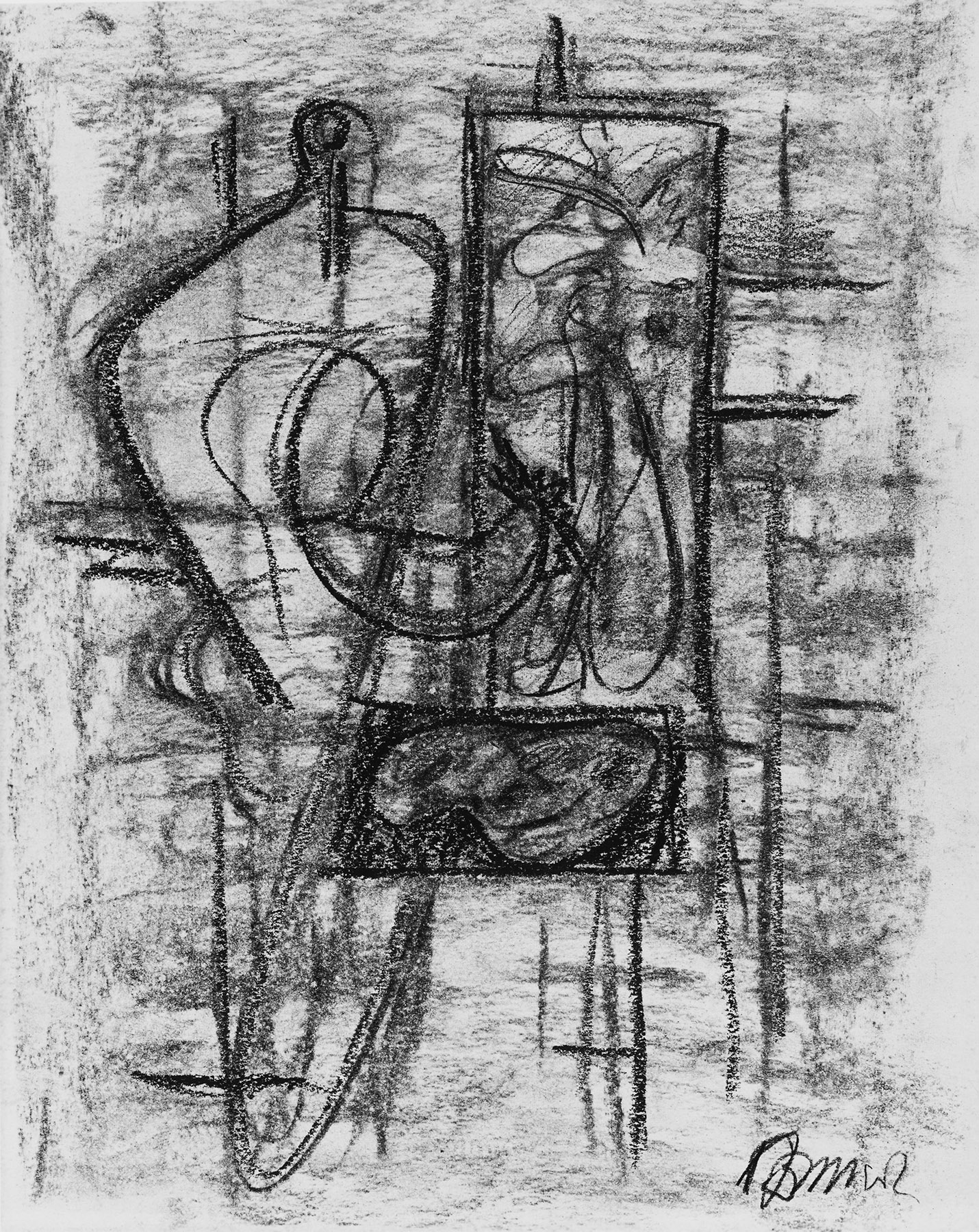 Kohle, gewischt, Farbkreiden, auf gelblichem Zeichenkarton