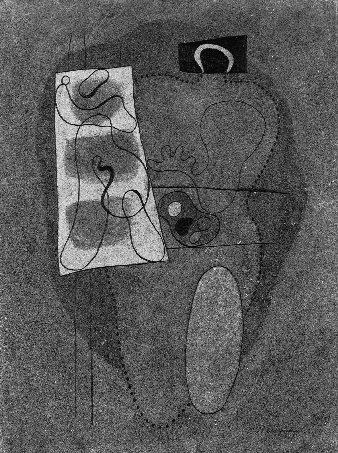 Bleistift, Kohle, gewischt, radiert, Ritzkonturen, Einfassungslinien mit Lineal, auf chamoisfarbigem Zeichenkarton