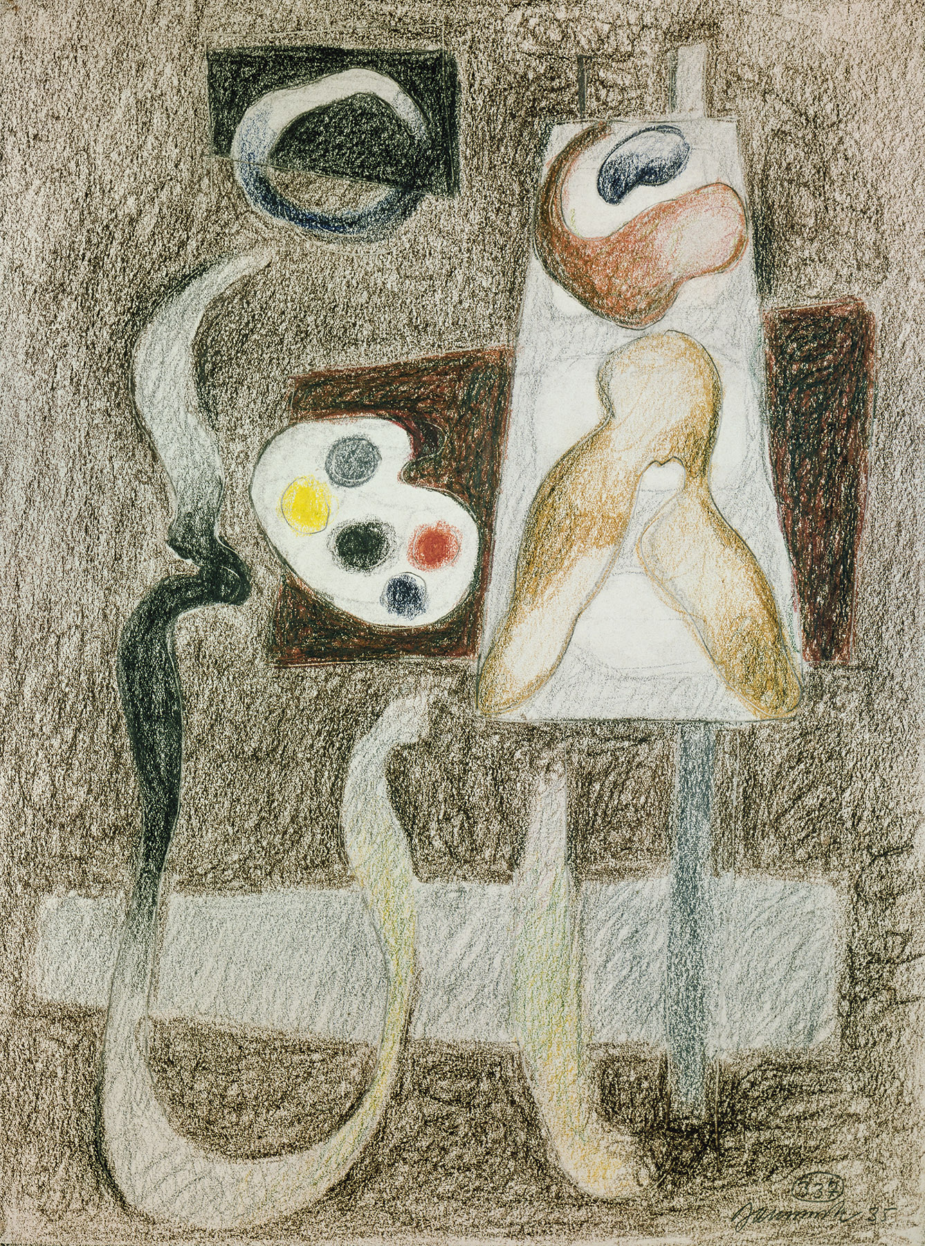 Bleistift und Ölkreide in Schwarz, Grau, Dunkelbraun, Rot, Gelb, Orange, Ocker, Grün, Blau, Konturen mit hartem Bleistift z. T. blind vorgeritzt (mit Abweichungen), auf chamoisfarbigem, am Rand l. perforiertem Zeichenkarton