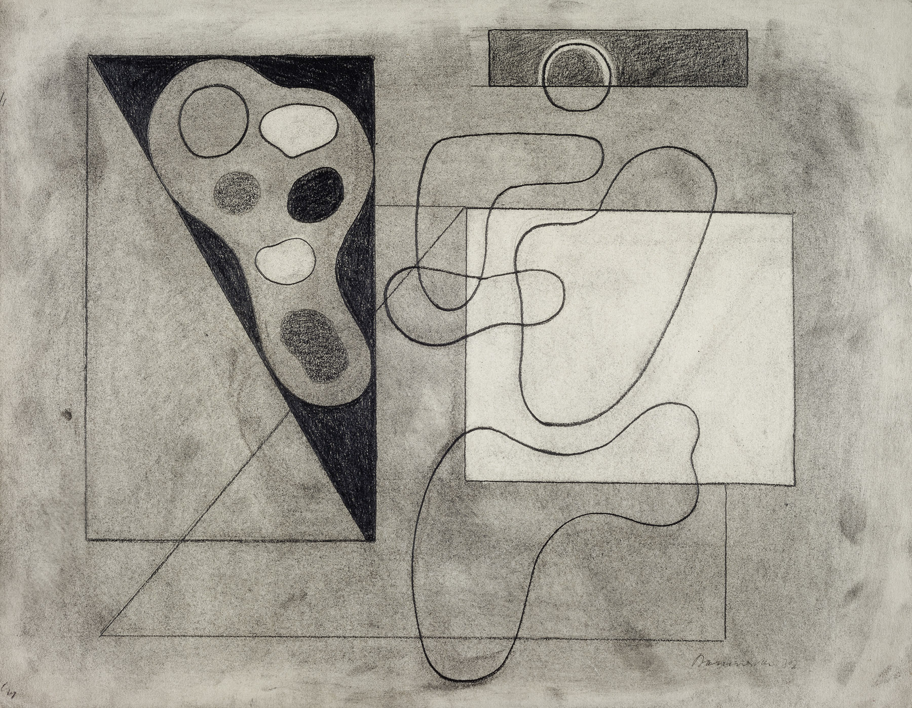 Bleistift, unter Verwendung des Lineals, Kohle, gewischt, fixiert, Konturen vorgeritzt (mit Abweichungen), Skizzierung in Kohle (mit Abweichungen), auf chamoisfarbigem, am Rand o. perforiertem Zeichenkarton