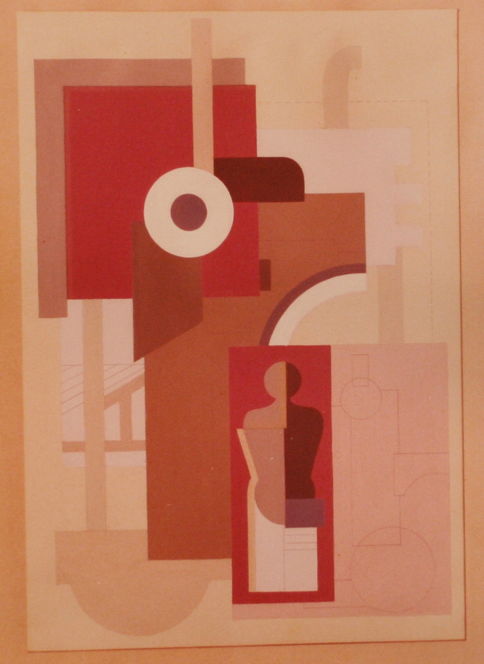 Bleistift, Deckfarbe in Rot, Blau, Grau, Schwarz, Weiß, Rosa, auf chamoisfarbigem Zeichenkarton