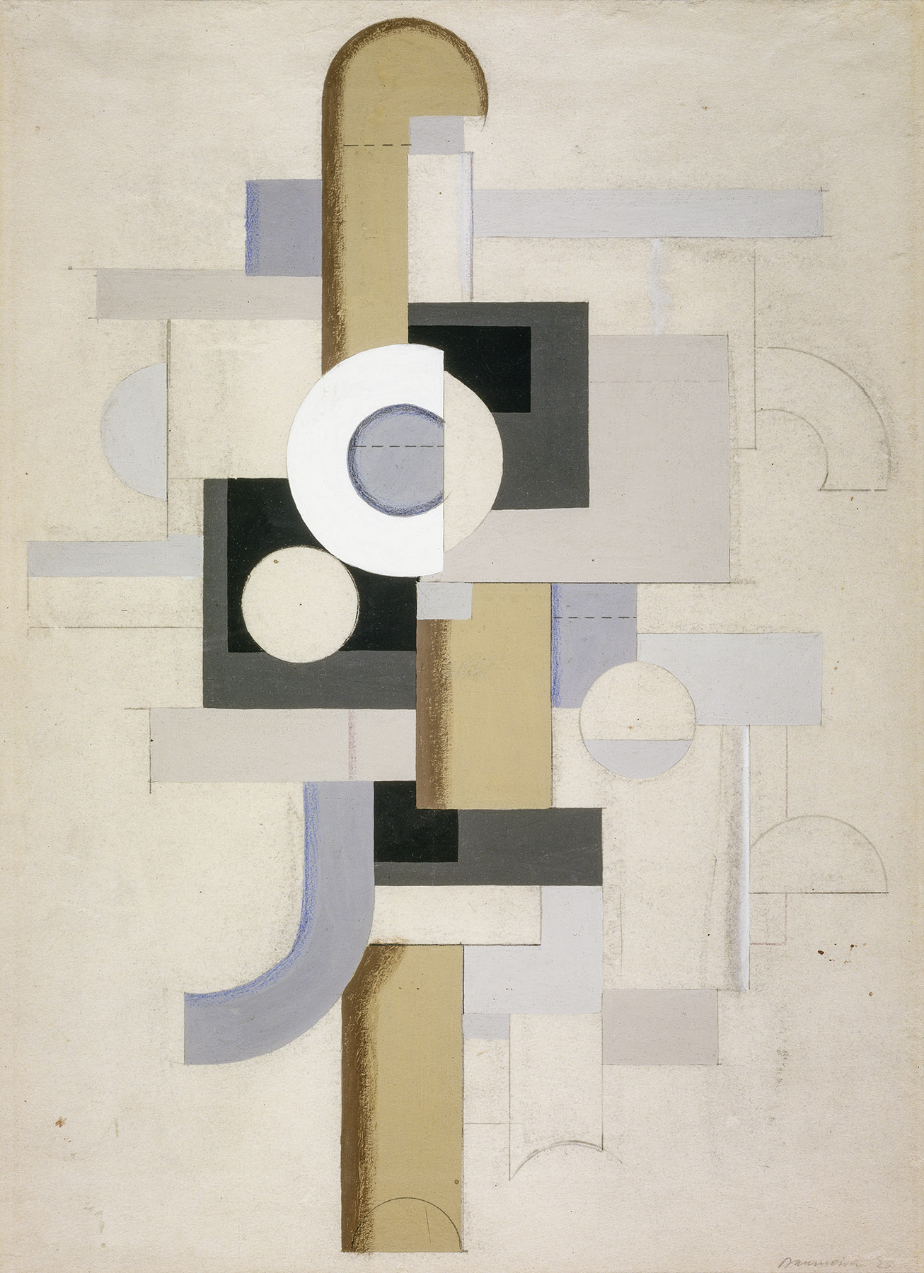 Kohleskizze, gewischt, Bleistift, unter Verwendung von Zirkel und Lineal, Ölkreide in Rot und Blau, Deckfarbe in Weiß, Schwarz, Grau, Beige, Braun, auf chamoisfarbigem Zeichenkarton