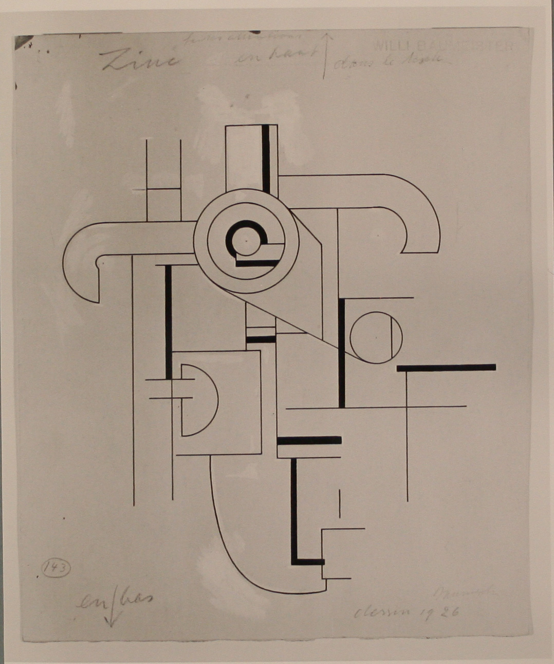 Wie durch die Auf- und Beischriften ausgewiesen, handelt es sich hier um eine Um- und Reinzeichnung für eine Strichätzung in der Publikation „Sélection“ im Jahre 1926. Ob eine wirklich originäre Zeichnung Vorgelegen hat, eventuell älteren Datums, muß offenbleiben. Bei der Komposition handelt es sich um ein Maschinenbild des labilen Gleichgewichtes.