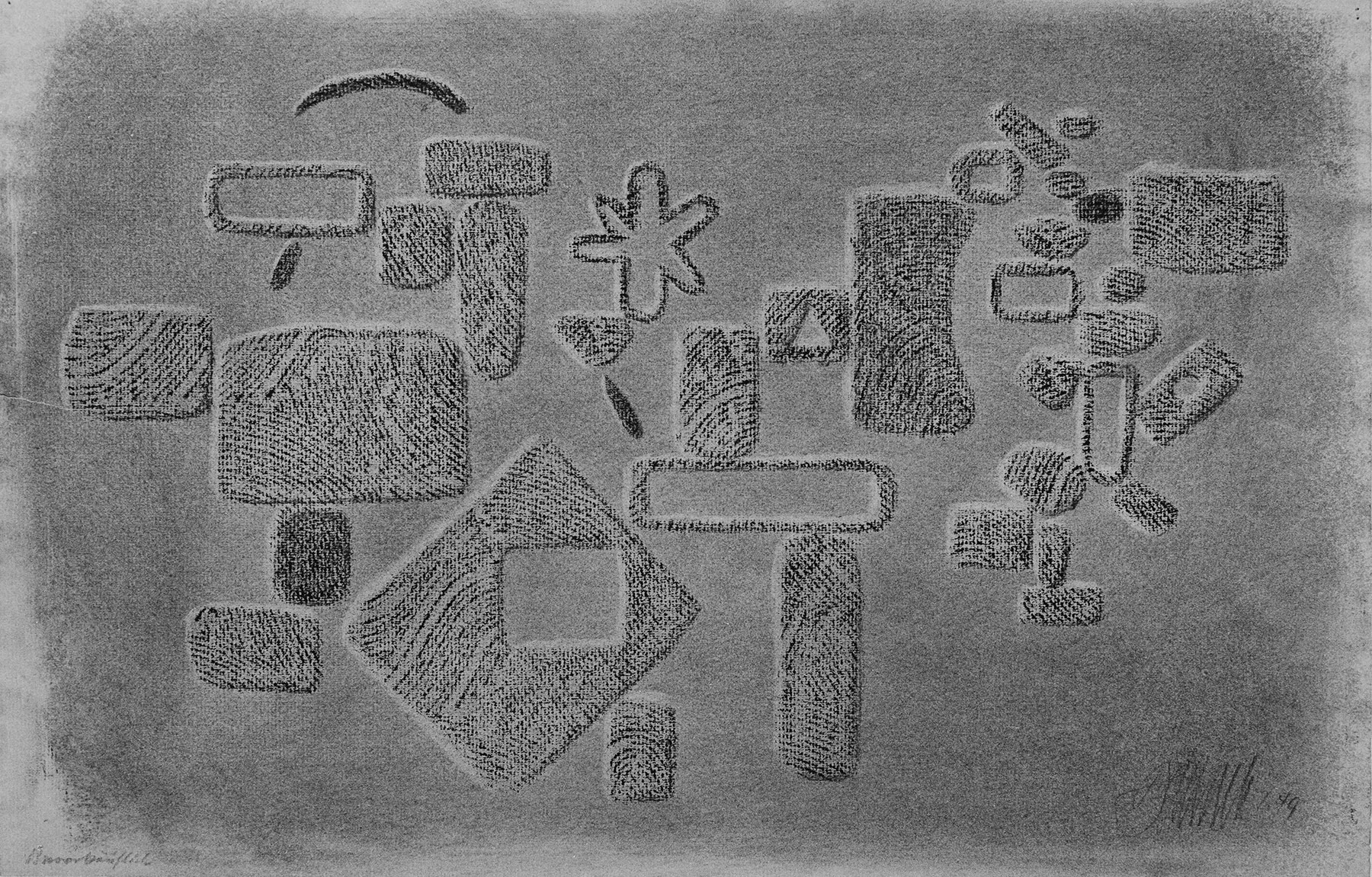 Kohle, gewischt, radiert, Ölkreide in Schwarz, durchgerieben, fixiert, auf beigefarbigem Ingres-Bütten mit Wz. l. u.: INGRES