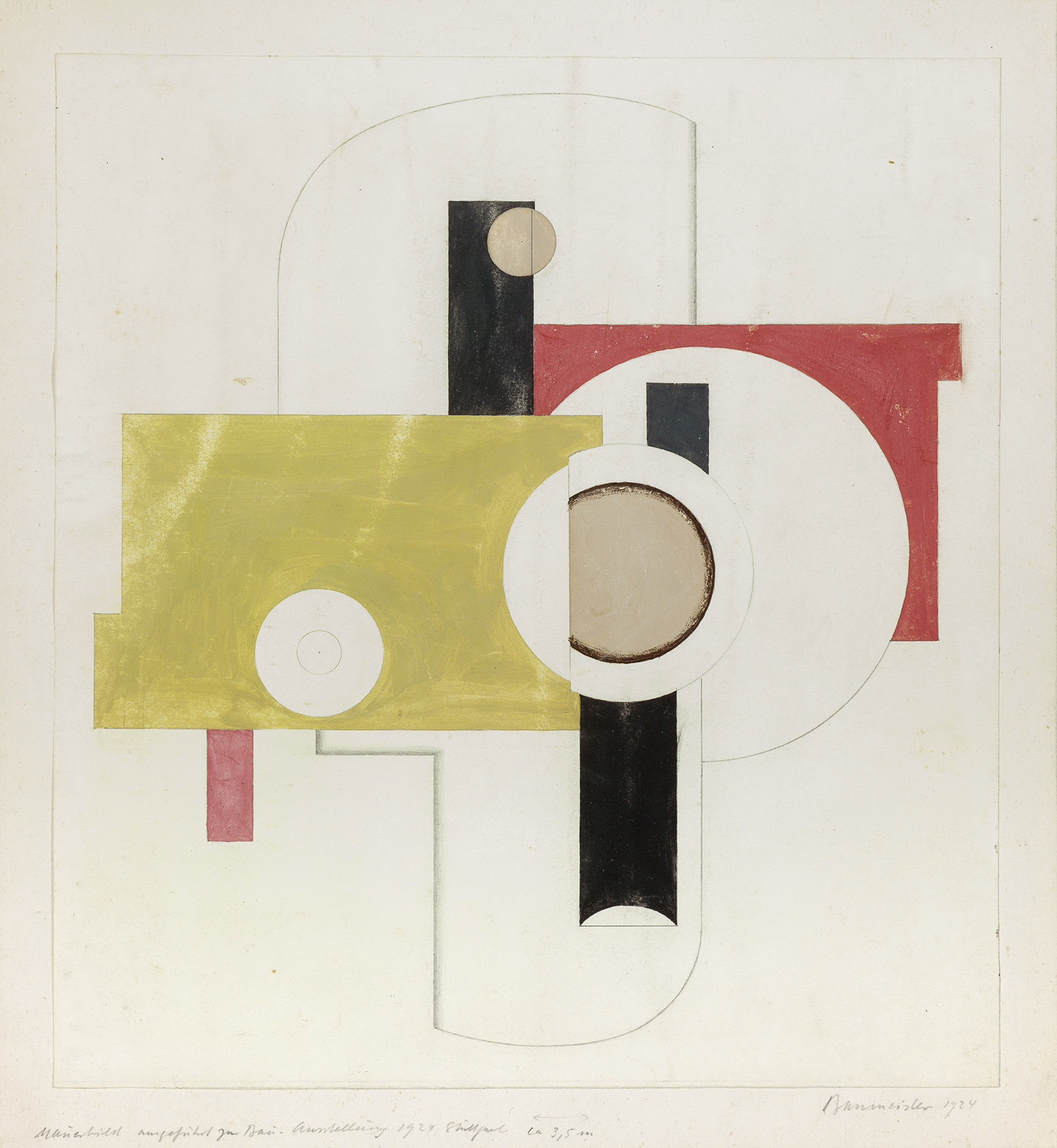 Bleistift, unter Verwendung von Zirkel und Lineal, Deckfarbe in Schwarz, Rot, Ocker, Lindgrün, auf chamoisfarbigem, starkem Zeichenpapier, auf starken Karton montiert
