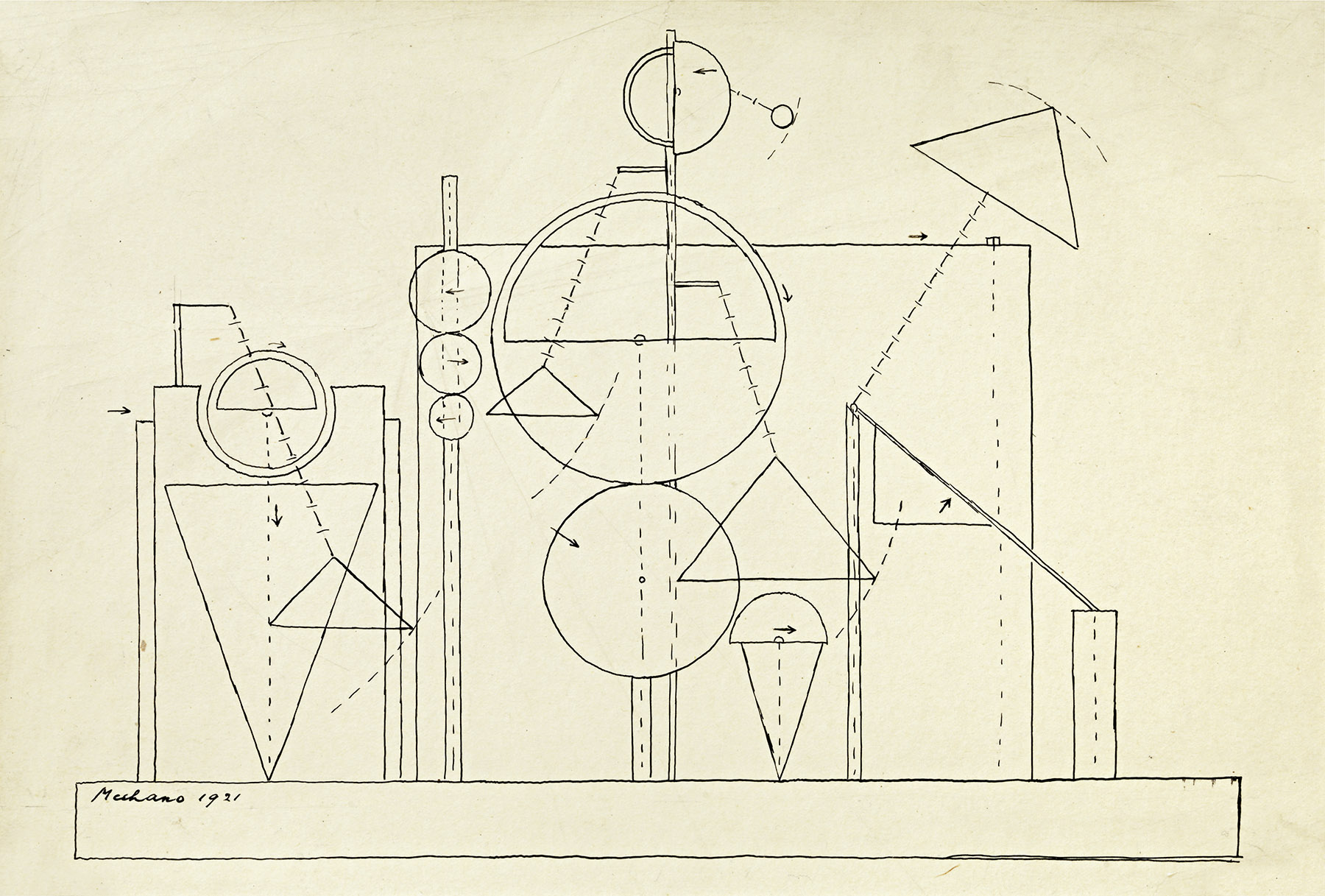 Diese einzigartige Zeichnung entstand im Zusammenhang mit einem kunsttheoretischen Aufsatz, der zum ersten Mal 1924 in Pásmo veröffentlicht wurde. Die Komposition verdeutlicht das konstruktivistische Formprinzip als Interpretation des Verhältnisses von Figur und Maschine in Raum und Fläche: Bezüge und Bewegungsabläufe werden visualisiert. Die Prinzipien der Kunst Baumeisters werden auf diese Weise sichtbar. Die Technik der Zeichnung ist bestimmt von der Funktion als Vorlage für die Strichätzung. Aus Baumeisters Aufsatz „Mechanisch-bewegte-Schaureklame“, um 1924: ... „Der Verfasser hat sich vor einigen Jahren daran gemacht ohne zunächst an die Ausnützung für die Reklame zu denken, so gut und mangelhaft die Vorstellung es zuläßt, ein Kunstwerk entstehen zu lassen, dem als Gestaltungsmittel die reale Bewegung zu Grunde gelegt ist: Mechano (1921) Das Mechano ist Gestaltung mit Zeit. Als Maschine hat es keinen praktischen Zweck. Es hat einen realen Zweck als künstlerische Kraftentfaltung unserer Zeit“ ... zitiert nach maschinenschriftlichem Manuskript im Archiv Baumeister. (fkb)