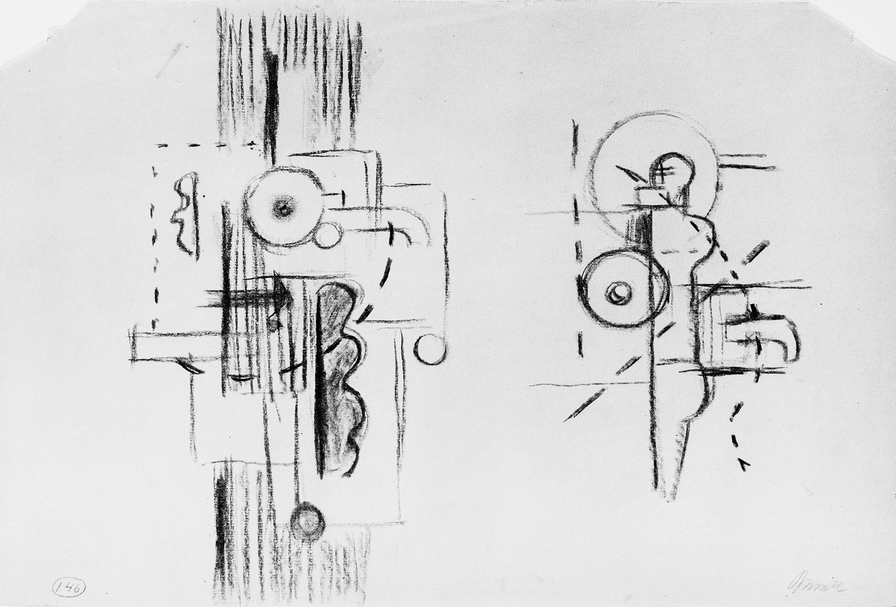 Kohle auf chamoisfarbigem Maschinen-Bütten mit Wz. GOHRSMÜHLE (2 mal 2 verschiedene, jedes beschnitten)