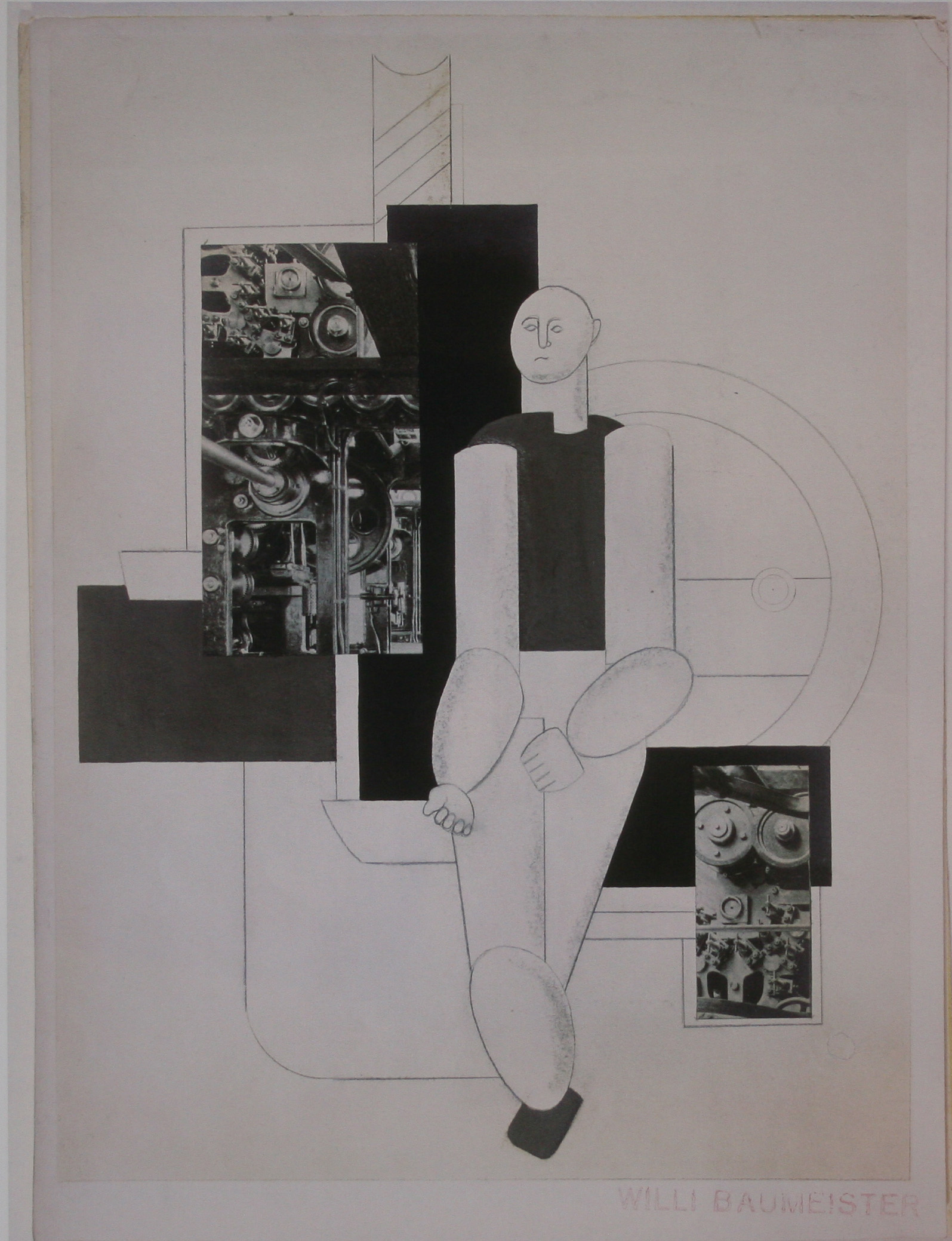 Bleistift, Flächen in Schwarz und heller Collage aus ausgeschnittenen Teilen einer Zeitschrift, auf chamoisfarbigem Zeichenkarton