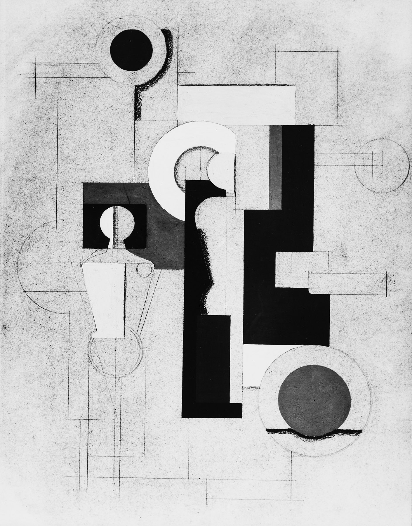 Kohle, gewischt, Bleistift, unter Verwendung von Zirkel und Lineal, Deckfarbe in Schwarz, Ocker, Braun, Grau, Einfassungslinien, auf chamoisfarbigem Zeichenkarton