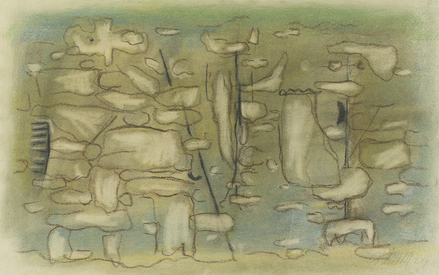 Kohle, z. T. gewischt, Pastell in Braun, Grün, Blau, Gelb, z. T. gewischt, radiert, fixiert, auf chamoisfarbigem Ingres-Bütten mit Wz. l. o.: PMF (ITALIA)