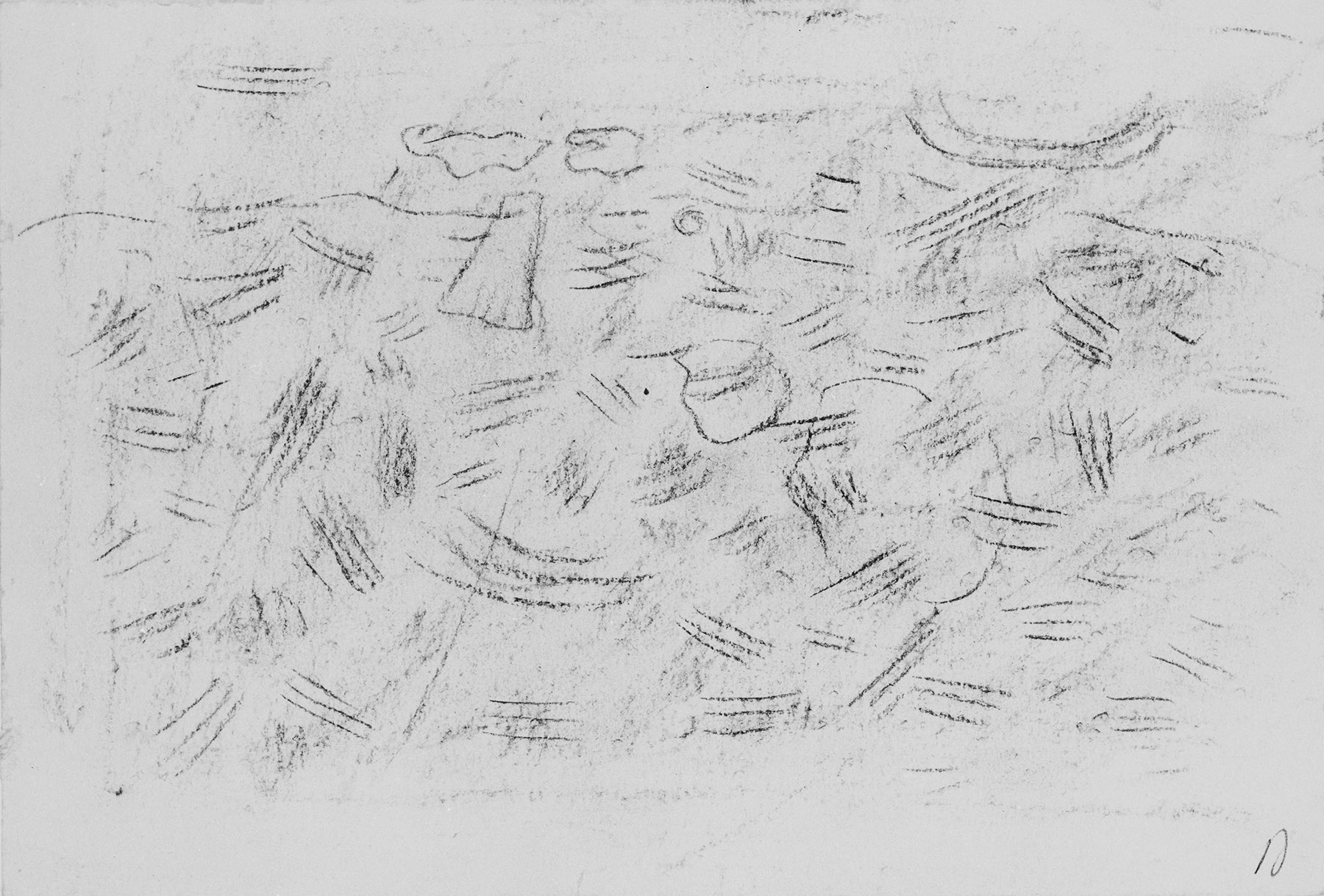 Kohle, z. T. gewischt, fixiert, auf chamoisfarbigem, am Rand u. im scharfen Knick leicht unregelmäßig abgetrenntem Zeichenkarton