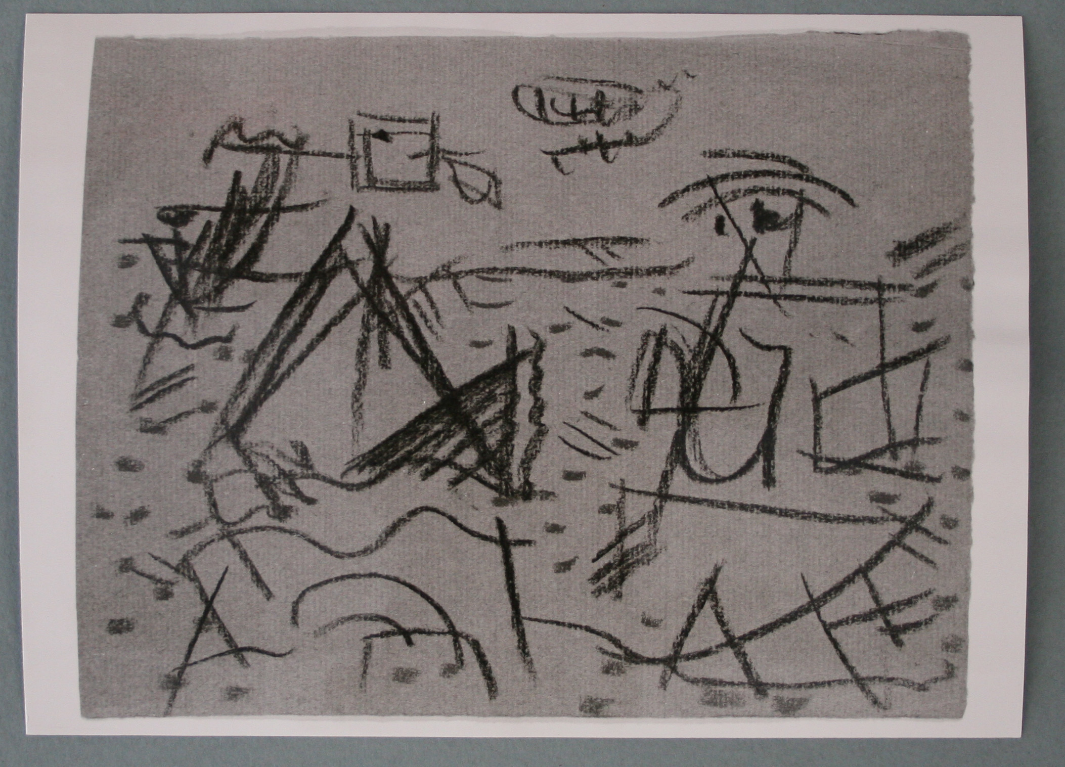 Kohle, Pastell in Rot, Gelb, fixiert, auf graugrünem Ingres-Bütten