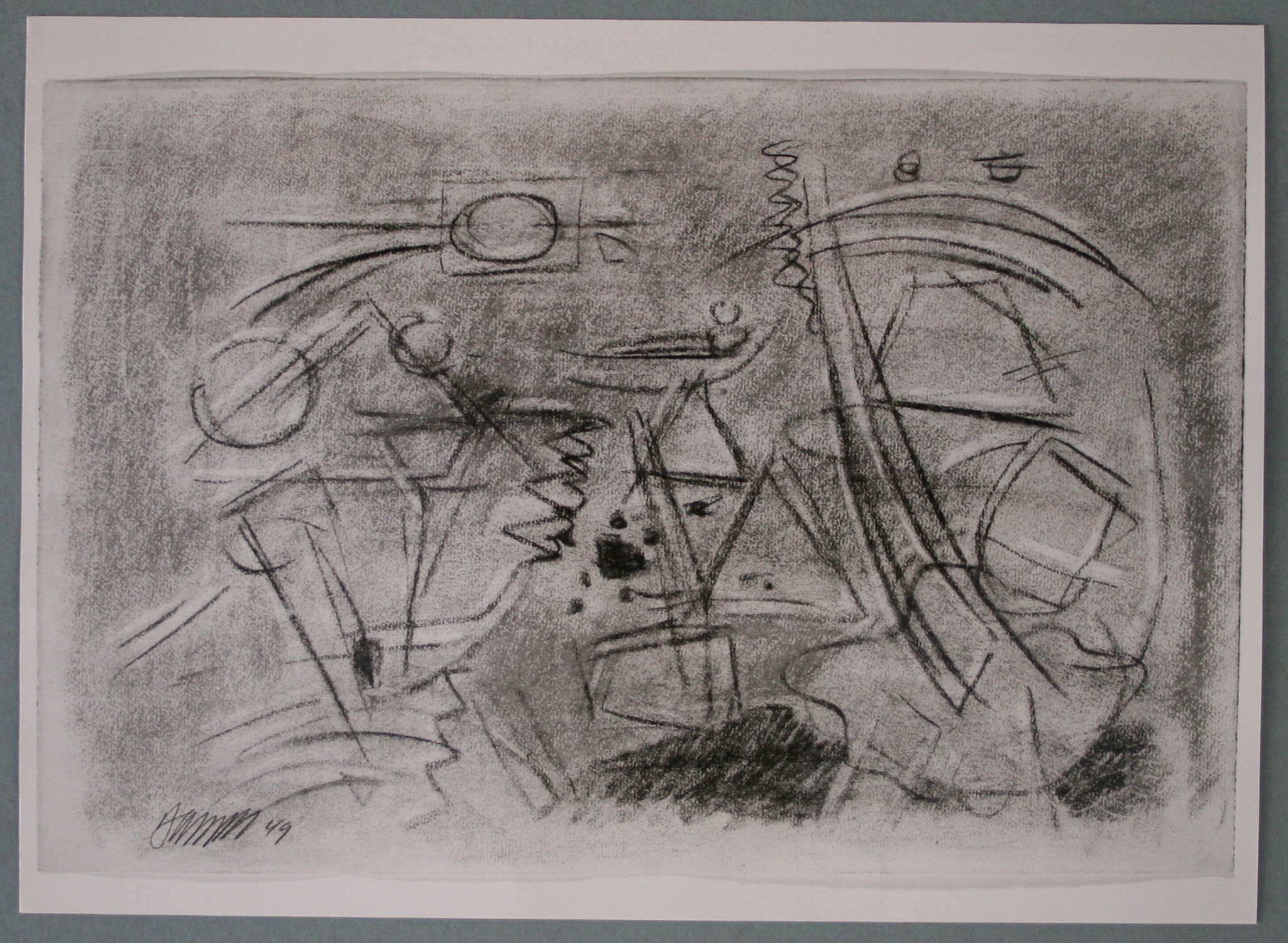 Kohle, Pastell in Grau, Blau, Rot, Orange, Grün, radiert, fixiert, auf chamoisfarbigem Ingres-Bütten mit Wz. l. o.: .ONTGOLFIER FRANCE und r. u.: Kartusche