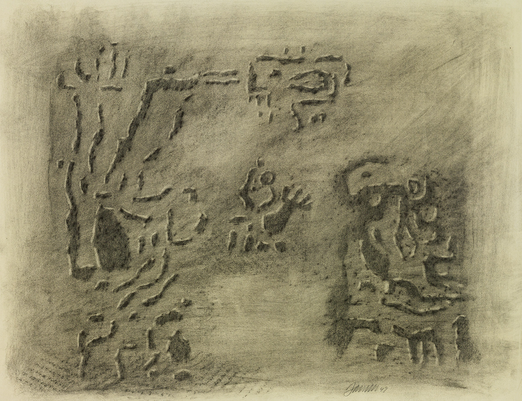 Kohle, gewischt, radiert, Ölkreide in Schwarz, durchgerieben, fixiert, auf maisgelbem Ingres-Bütten mit Wz. o. Mitte: CANSON & MONTGOLFIER FRANCE, l. u.: INGRES und r. u.: Kartusche