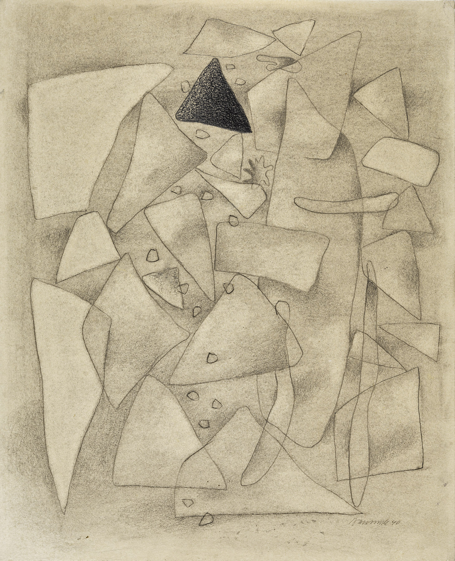 Kohle, gewischt, Bleistift, fixiert, Konturen z. T. mit spitzem Gegenstand gepaust und eingedrückt, dann mit Bleistift übergangen, auf chamoisfarbigem Zeichenkarton
