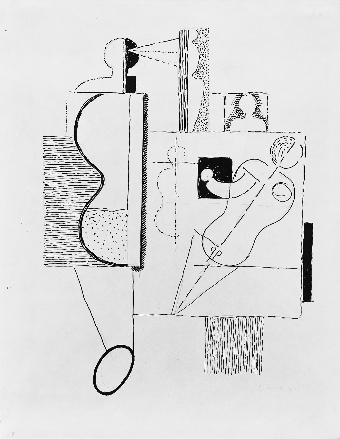 Die Komposition entspricht den Gemälden G 107 und 112, die beide auf 1920 datiert sind. Die Pentimenti zeigen, daß es sich hier weniger um den Entwurf als vielmehr um eine Nachzeichnung handelt, die die Komposition festhalten will. Darauf weisen auch die verschiedenen Schraffuren und die Schattierungen hin, die das Farbrelief des Bildes imitieren. Vgl. Z 70.