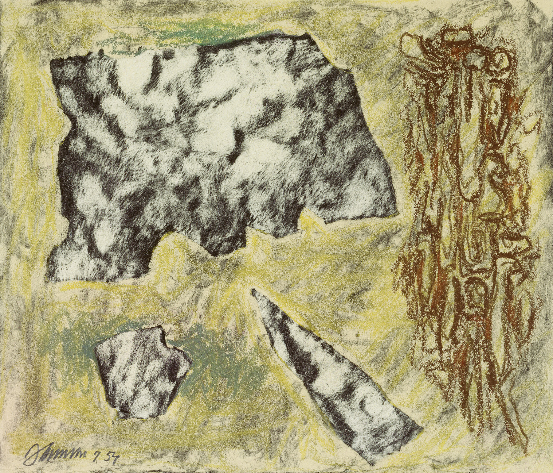 Kohle, gewischt, Pastell in Gelb, Grün, Braun, Collage mit chamoisfarbigem Ingres-Bütten, gerissen, auf gelblichem, starkem, am Rand l. und o. leicht unregelmäßig beschnittenem, am Rand u. im scharfen Knick gebrochenem Holzschliffkarton