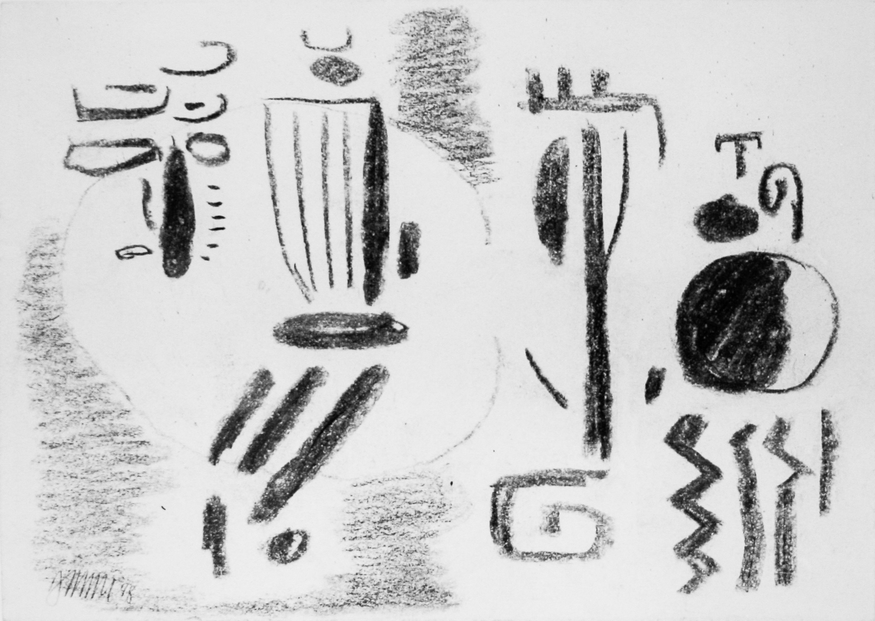 Kohle, Pastell in Violett, fixiert, auf chamoisfarbigem Maschinen-Bütten