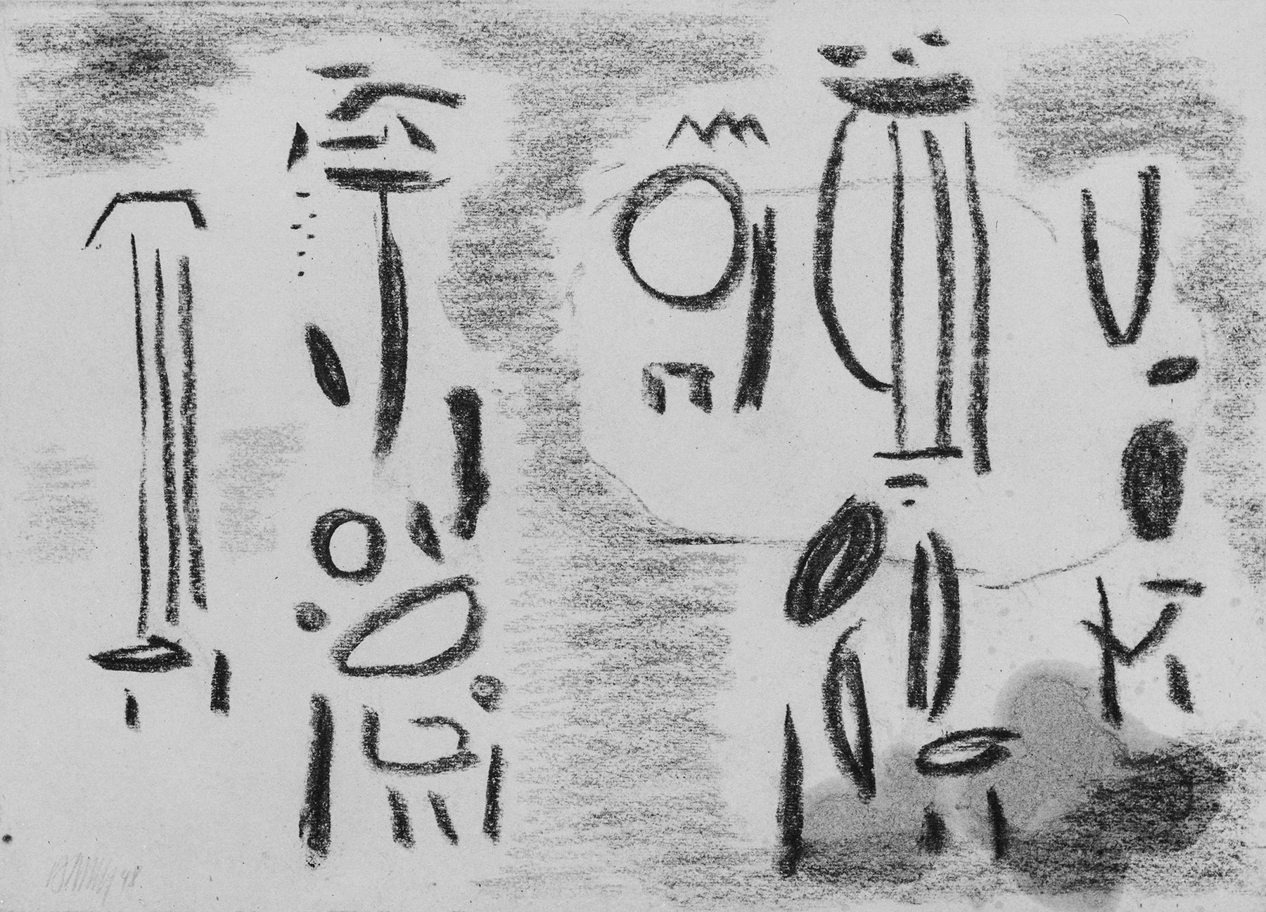 1876-1879: In dieser Gruppe der sogenannten „Harfen-Bilder“, die eine Gemäldekomposition widerspiegeln, gelingt B. die zwanglose Reihung von isolierten, schematisch-ideogrammatischen Figuren.
