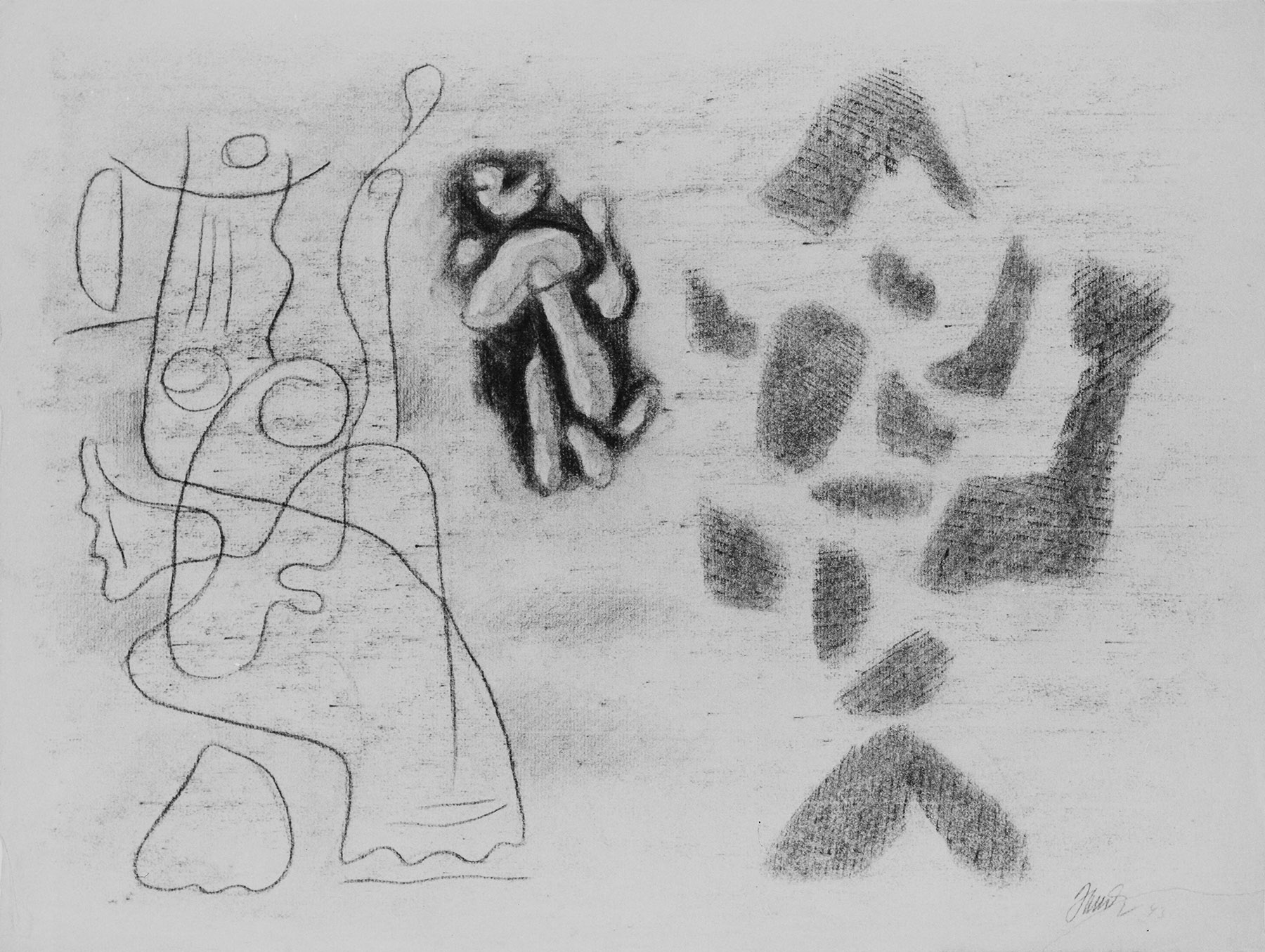 Kohle, gewischt, radiert, Ölkreide in Braun, Zinnober, Blau, Gelb, Grün, fixiert, auf chamoisfarbigem Ingres-Bütten