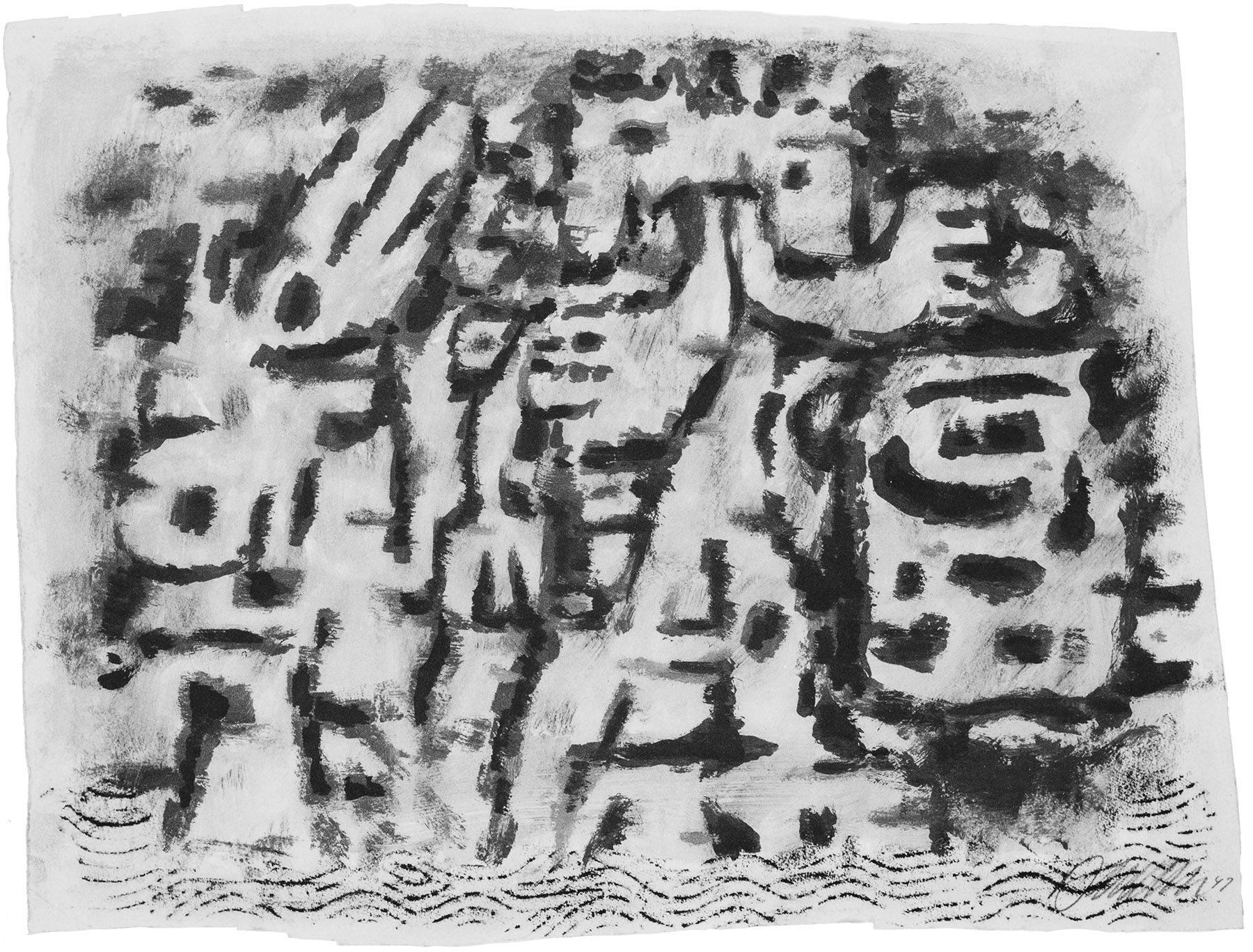 Deckfarbe in Grau, Braun, über Kohle, Ölkreide in Schwarz, durchgerieben, auf chamoisfarbigem, am Rand l. im scharfen Knick gerissenem, an den anderen Rändern z. T. stark unregelmäßig beschnittenem Zeichenkarton