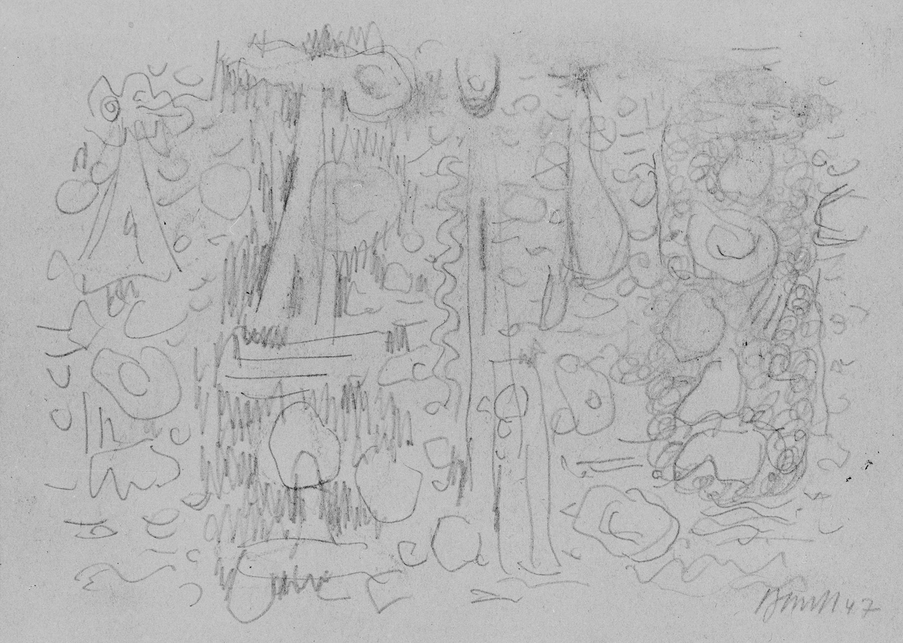 Skizze in Kohle oder Lithokreide, z. T. gewischt, Bleistift (Konturen stark eingedrückt), auf chamois- bis beigefarbigem, holzhaltigem, am Rand o. unregelmäßig gerissenem Konzeptpapier, verso geschwärzt mit Lithokreide (?)