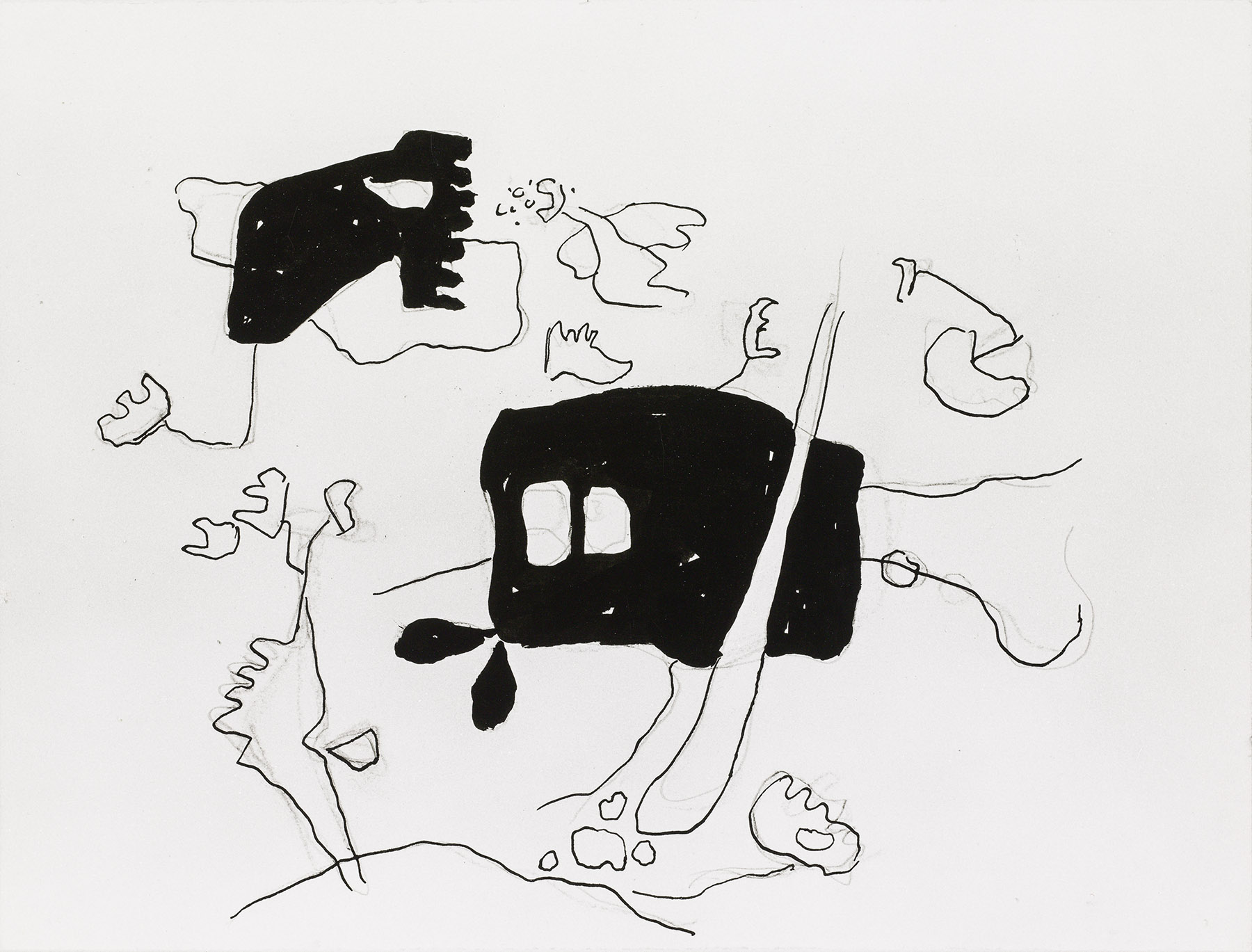 Feder und Pinsel in Ausziehtusche in Schwarz, Skizze in Kohle, auf chamoisfarbigem Zeichenkarton