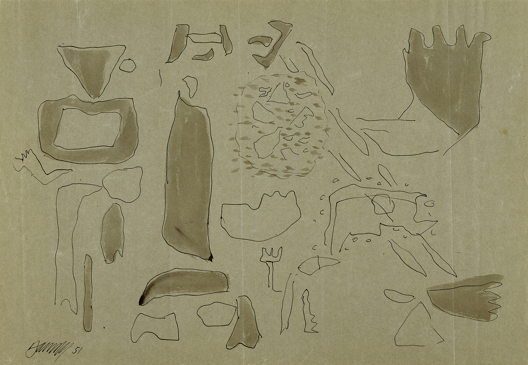 Feder in Ausziehtusche in Schwarz, grau laviert, auf gelblichgrauem Papier