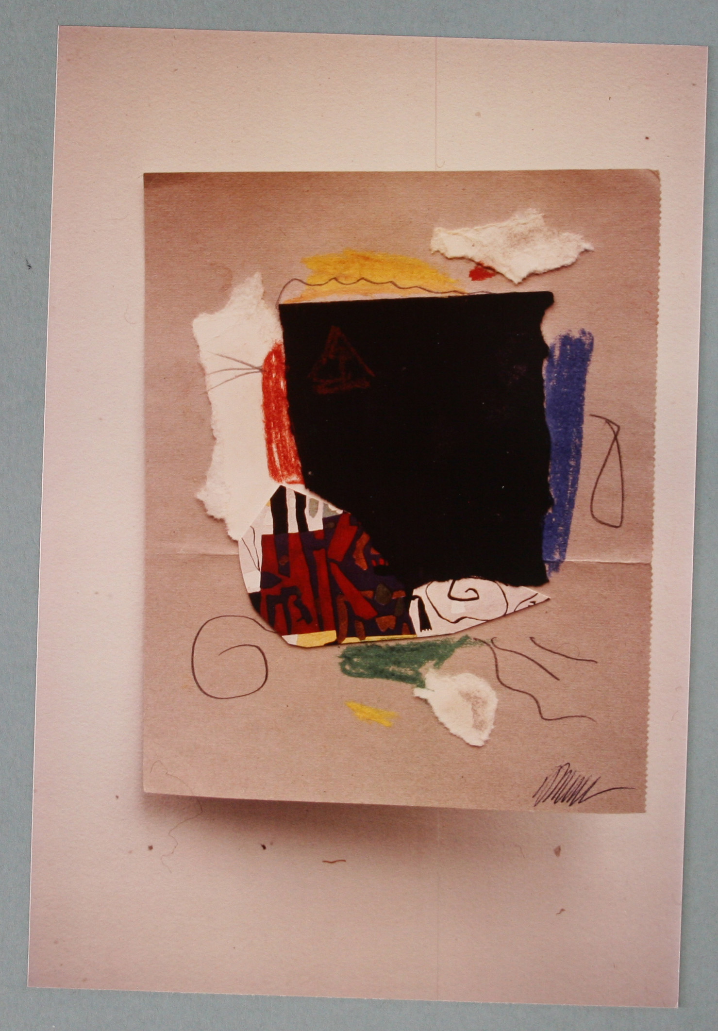Bleistift, Pastell in Rot, Blau, Grün, Gelb, Collage mit schwarzem und weißem Plakatkarton, Teile der Reproduktion eines Gemäldes von B. aufgeklebt, auf hellgrauem, am Rand r. perforiertem Ingres-Bütten