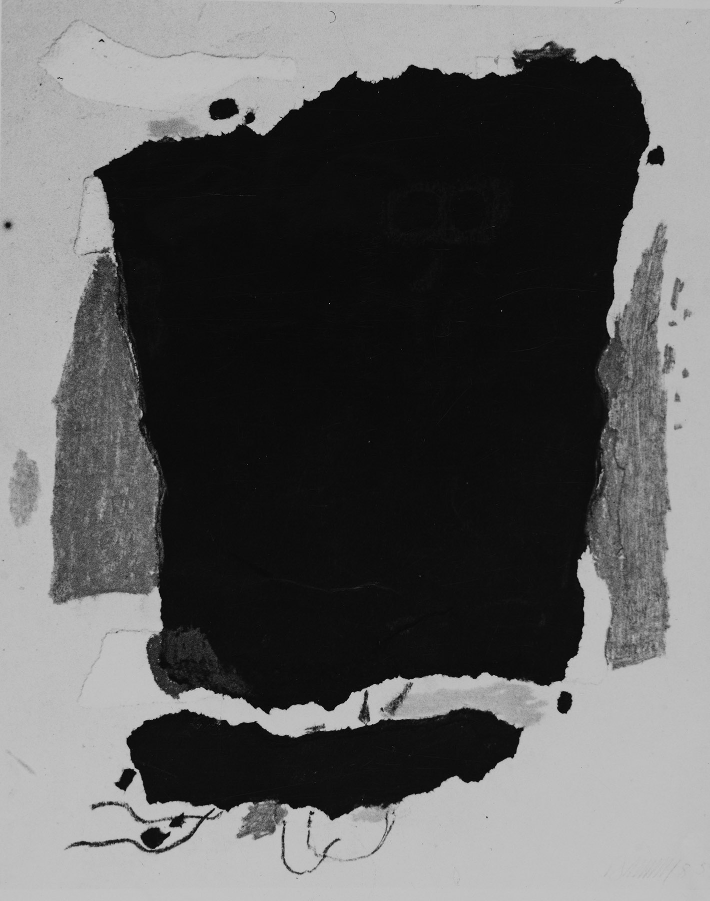 Pastell, Collage mit schwarzem Fotokarton und chamoisfarbigem Ingres-Bütten, gerissen, auf türkisfarbigem (?) Karteikarton