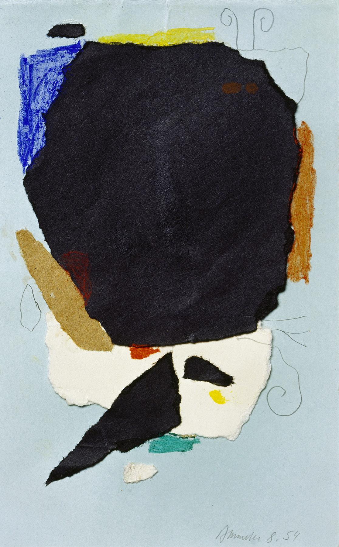 Bleistift, Pastell in Blau, Gelb, Grün, Orange, Rot, Braun, Collage mit schwarzem Fotokarton und chamoisfarbigem Zeichenkarton, braunem Holzschliffpapier (Packpapier), Ränder gerissen, auf helltürkisfarbigem, am Rand r., l. und o. unregelmäßig gerissenem