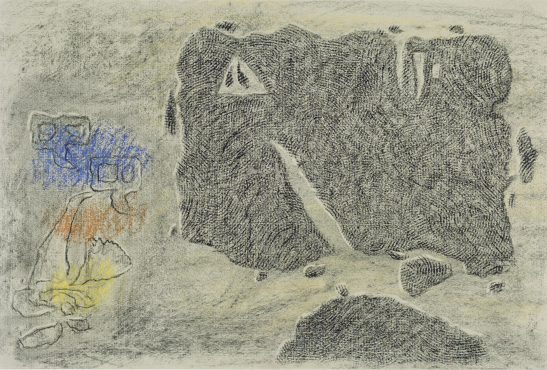 Kohle, gewischt, radiert, Ölkreide in Schwarz, durchgerieben, Pastell in Rot, Blau, Gelb, Ocker, fixiert, auf grauem Ingres-Bütten mit Wz. l. o.: INGRES