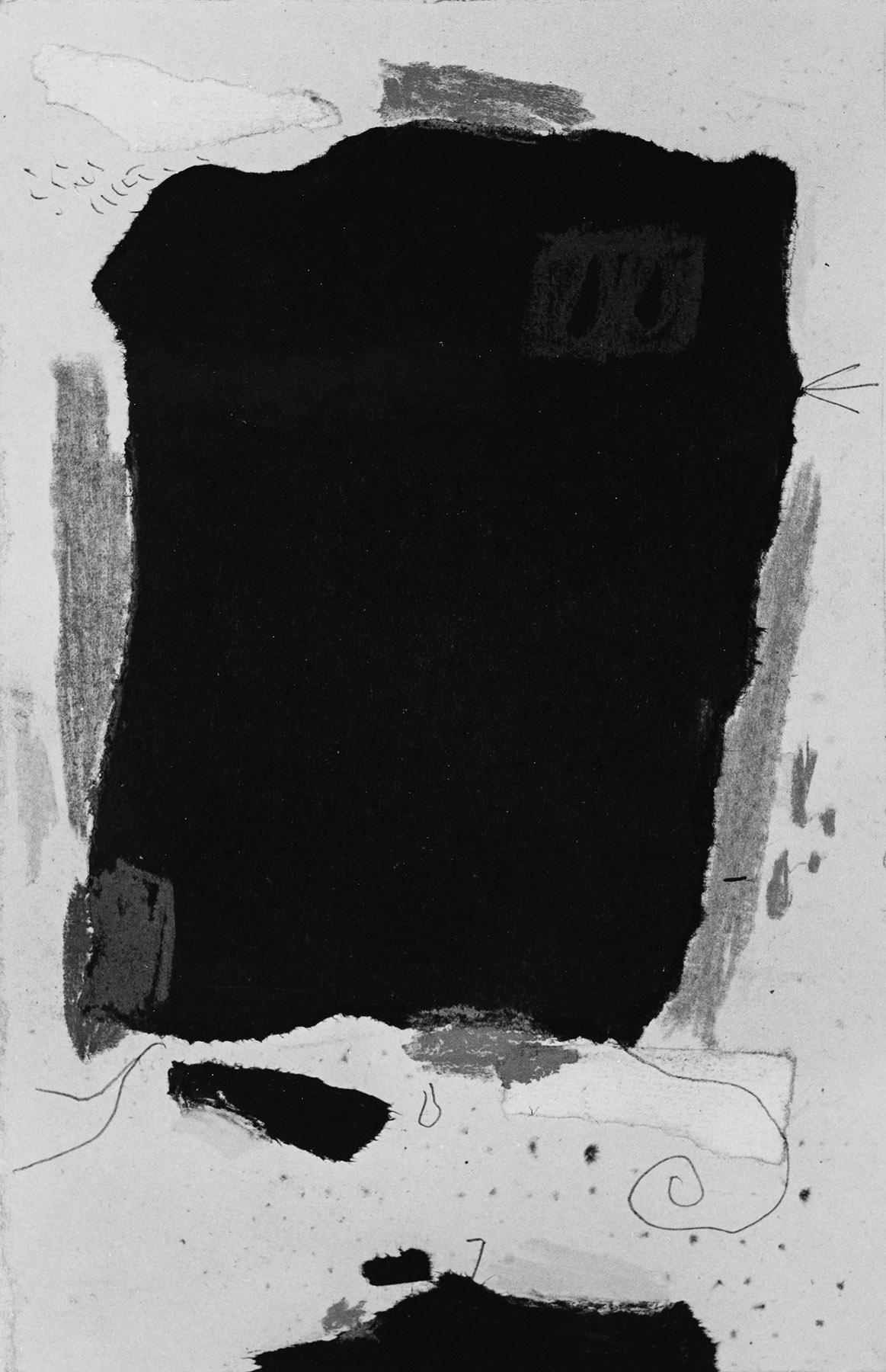 Bleistift, Pastell in Blau, Gelb, Grün, Violett, Blaugrau, Orange, Braun, Collage mit schwarzem Fotokarton und chamoisfarbigem Ingres-Bütten, Ränder gerissen, auf helltürkisfarbigem, am Rand o. und l. gerissenem Karteikarton