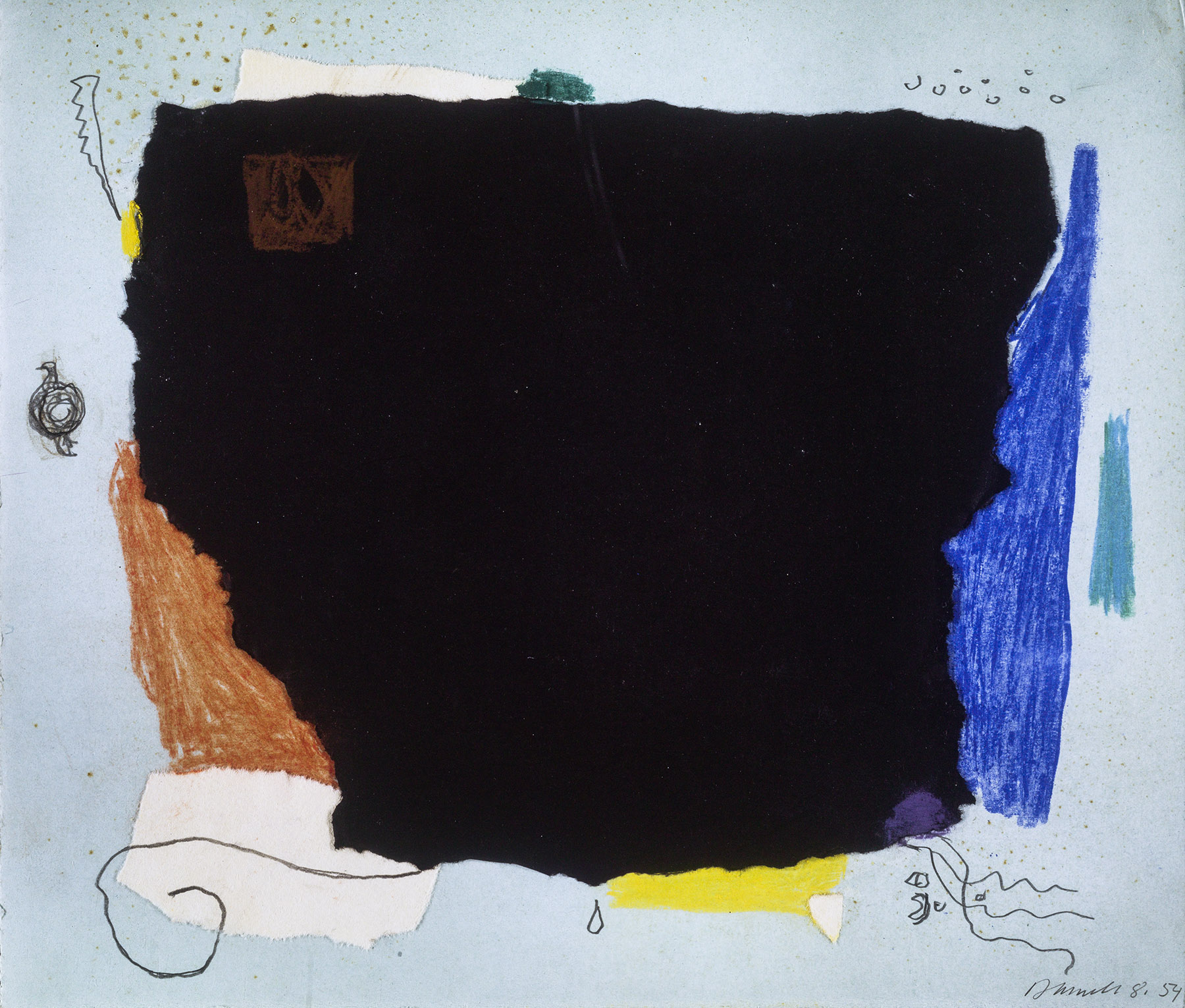 Bleistift, Pastell in Rot, Blau, Gelb, Grün, Braun, Collage mit schwarzem Fotokarton und chamoisfarbigem Ingres-Bütten, gerissen, auf helltürkisfarbigem, am Rand l. und u. im scharfen Knick gerissenem Karteikarton