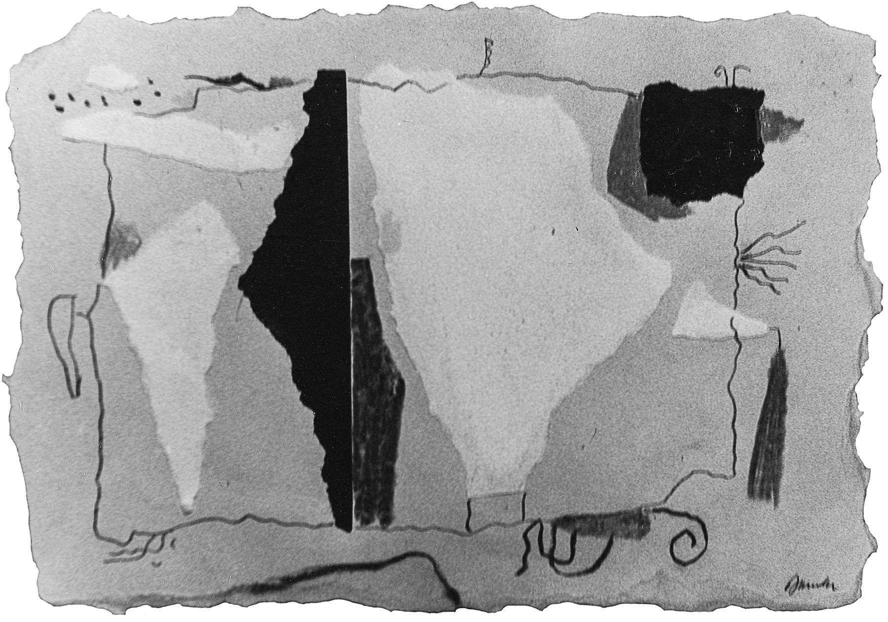 Bleistift, Pastell, Collage mit schwarzem Fotokarton und chamoisfarbigem Ingres-Bütten, gerissen, auf türkisfarbigem, unregelmäßig gerissenem Karteikarton