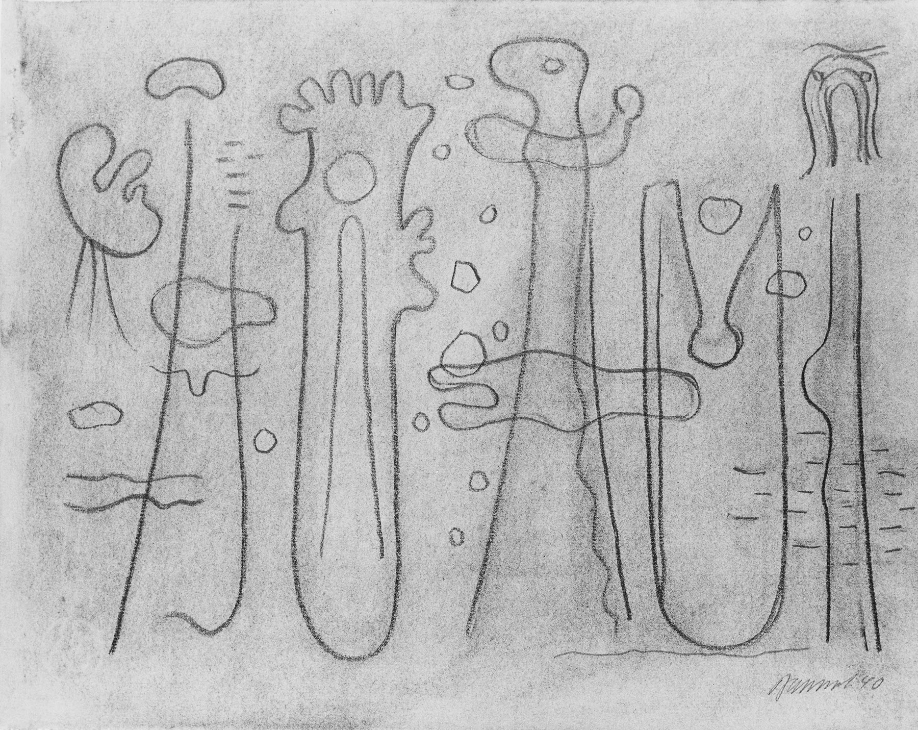 743-753: Breit angelegte Kompositionen, die aus dem unteren Teil des „Eidos“-Motivs entwickelt sind. Die einzelnen Linienkompartimente werden figural interpretiert und nebeneinander aufgereiht. Es entstehen amorphe figürliche Gebilde, die wie die „Eidos“-Form selbst eine amöbenhafte Wirkung entfalten. Auch die Vorstellung von Wasser und „unter-Wasser“ ist lebendig. Bei Z 743, Z 744 und Z 750 tauchen wiederum Ritzkonturen auf. Die Verwendung von Ingres-Bütten bei einigen Blättern ist, zumindest im Jahre 1940, ungewöhnlich, da sie eigentlich erst mit der Arbeit an den Illustrationsfolgen eine Rolle spielt. Viele Blätter sind auf 1940/41 datiert, vielleicht ein erster Beleg für die Verwendung des später für die zeichnerische Tätigkeit so wichtigen Ingres-Papiers.