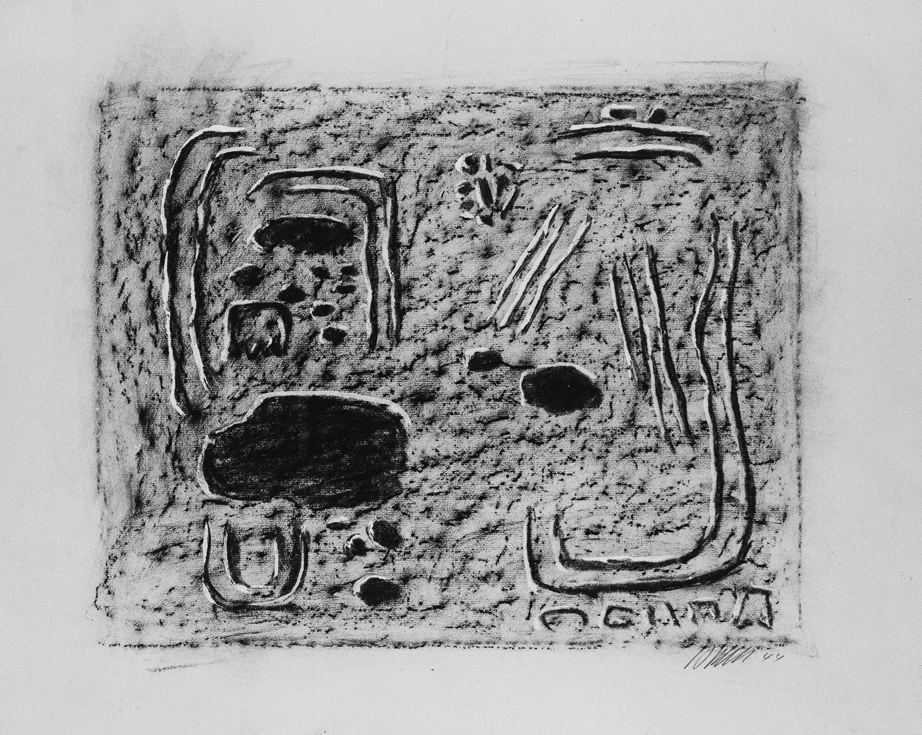 Vgl. die seitenverkehrte Radierung Sp 200 von 1947. Die Durchreibung der Zeichnung entstand wohl 1944 nach dem früheren Zustand des Gemäldes G 759, Zustandsfoto im Archiv Baumeister. Das Gemälde wurde 1946 überarbeitet, die Signatur und Datierung links unten teilweise übermalt. Die ehemalige Datierung ist nicht mehr entzifferbar. Das vollendete Bild wurde von B. auf der Rückseite mit 1946 datiert. (fkb) 1489-1494: Eine Gruppe von Zeichnungen, die noch den dialogischen Aufbau der Gilgamesch-Blätter aufweisen. Z 1489 und 1490 sind in das Jahr 1944 datiert. Ihre Komposition wurde 1947 für die Radierung Sp 200 seitenverkehrt übernommen. Z 1490 - 1494 sind entweder Skizzen aus dem Jahr 1944 oder Umzeichnungen für die Graphik von 1947.