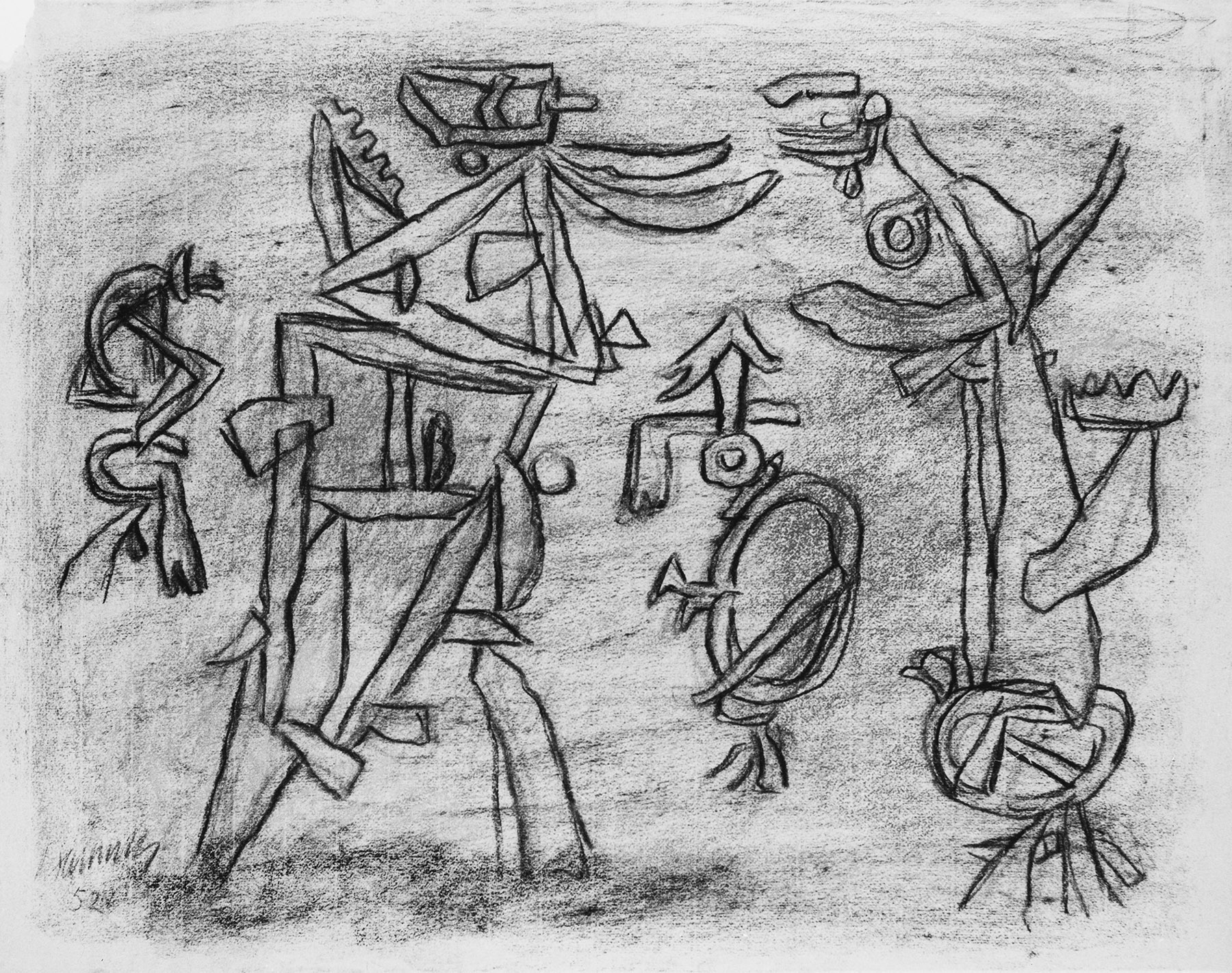 Vgl. die 1952 datierten Gemälde G 1345 und 1346. - Vgl. die Lithographie Sp 174, u. a. in bezug auf die Farbigkeit. (fkb) Vgl. die Strichätzungen in Grohmann, 1963, S. 142 und in: Willi Baumeister zum 65. Geburtstag von seinen Freunden, Stuttgart, 1954, S. 32. (fkb)