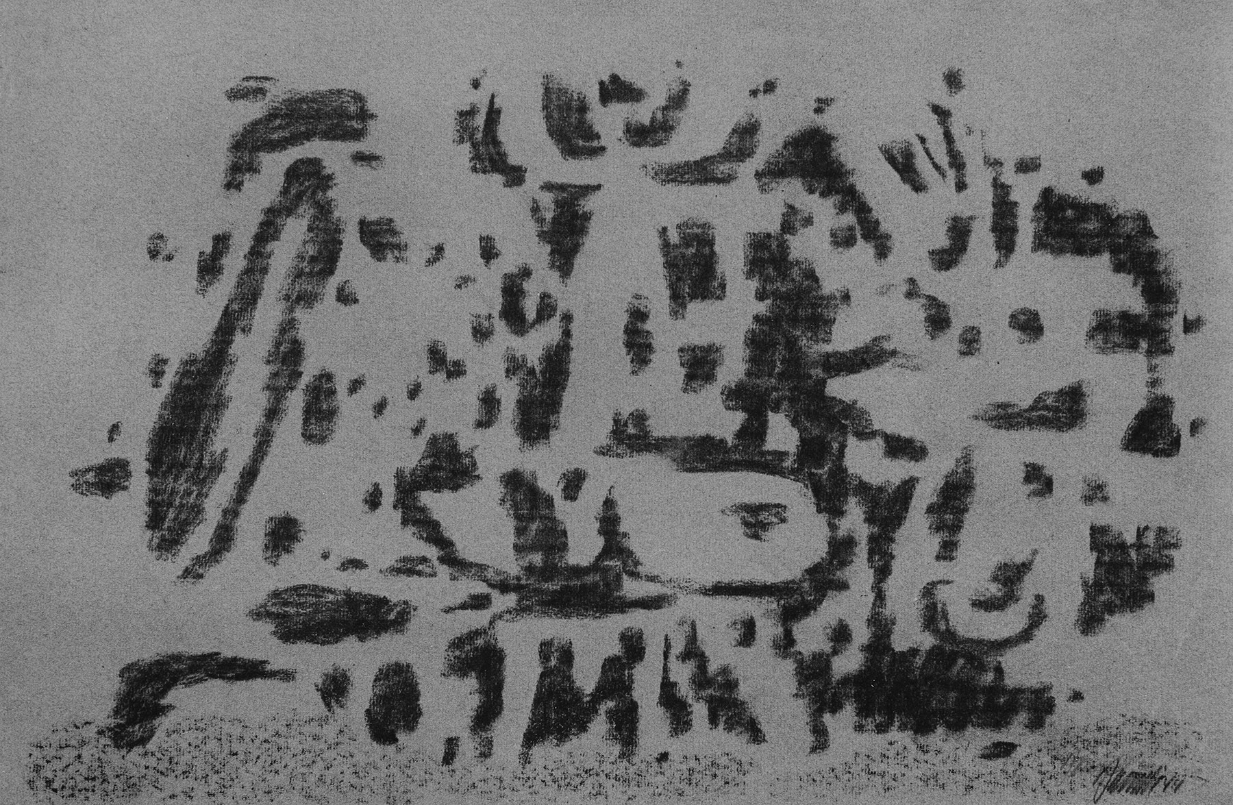 Kohle, Ölkreide in Schwarz, Braun, durchgerieben, fixiert, auf grauviolettem Ingres-Bütten mit Wz. r. o.: PMF (ITALIA)