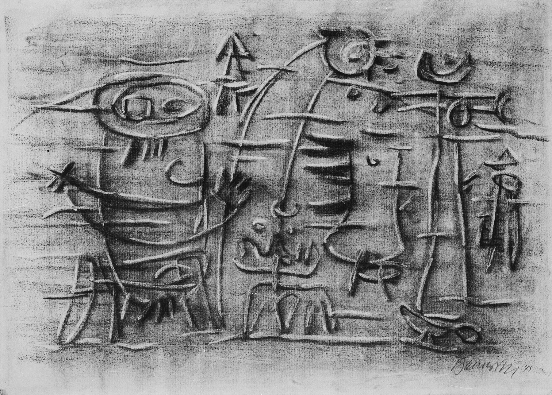 Kohle, gewischt, radiert, fixiert, auf farbigem Ingres-Bütten