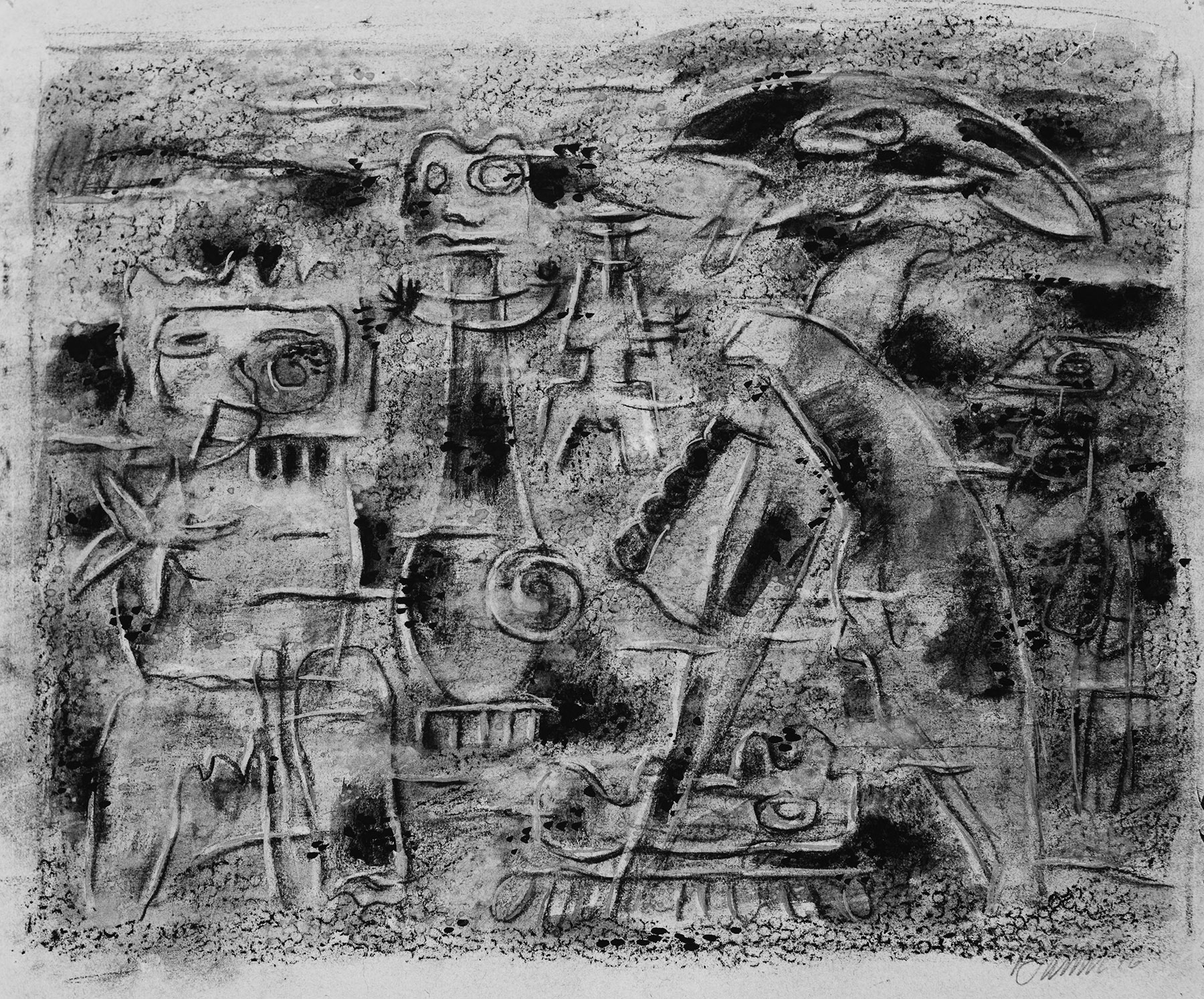 Kohle, gewischt, radiert, Kreide in Schwarz, durchgerieben, Pastell in Gelb, Blau, Rot, Orange, Ocker, Pinsel, fixiert, auf olivgrünem Tonpapier