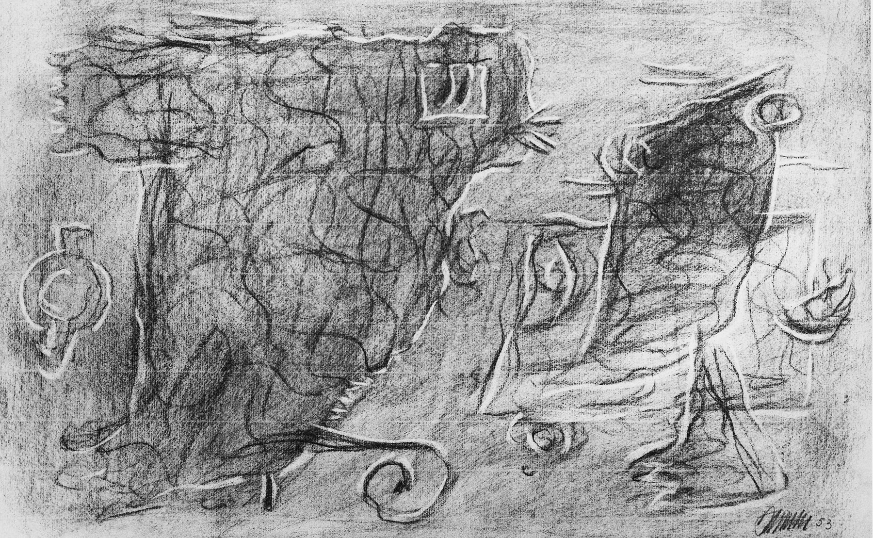 Kohle, gewischt, radiert, Farbkreiden, auf weißem Papier