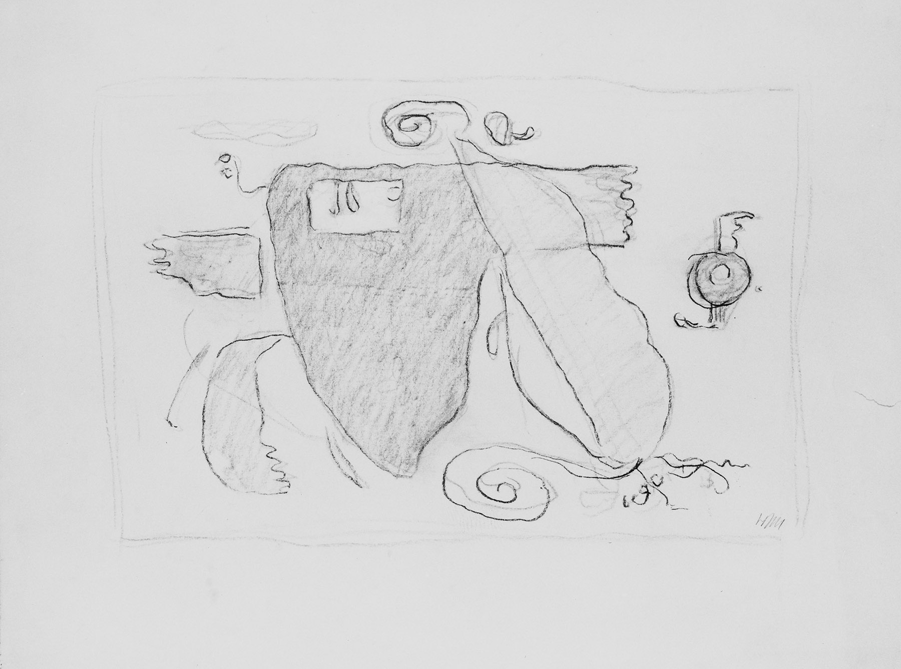 Kohle, Einfassungslinien, fixiert, auf chamoisfarbigem Bütten mit Wz. r. o.: P. M. FABRIANO (ITALY)