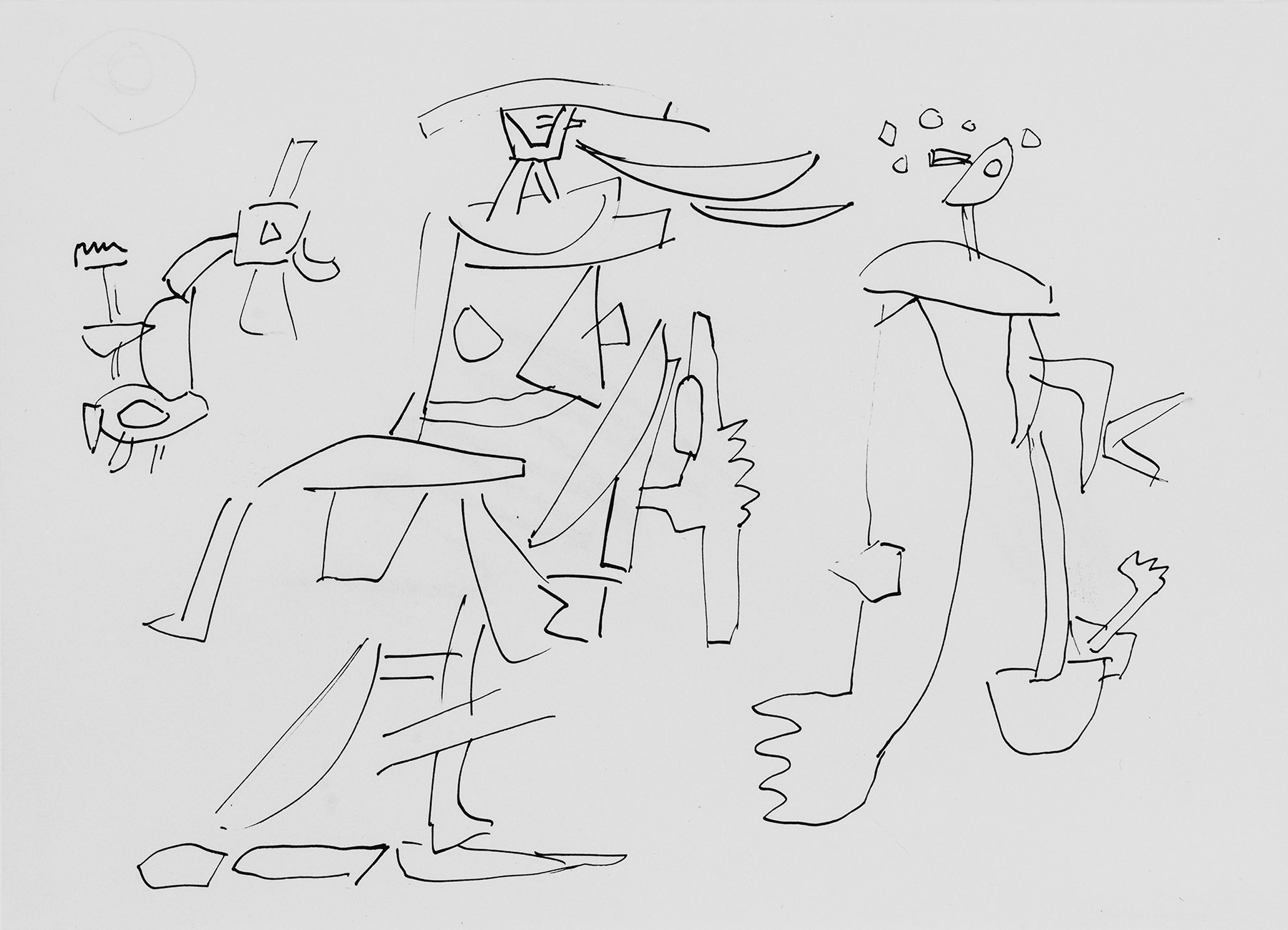 Feder in Tusche in Schwarz, Bleistift, auf chamoisfarbigem Schreibpapier