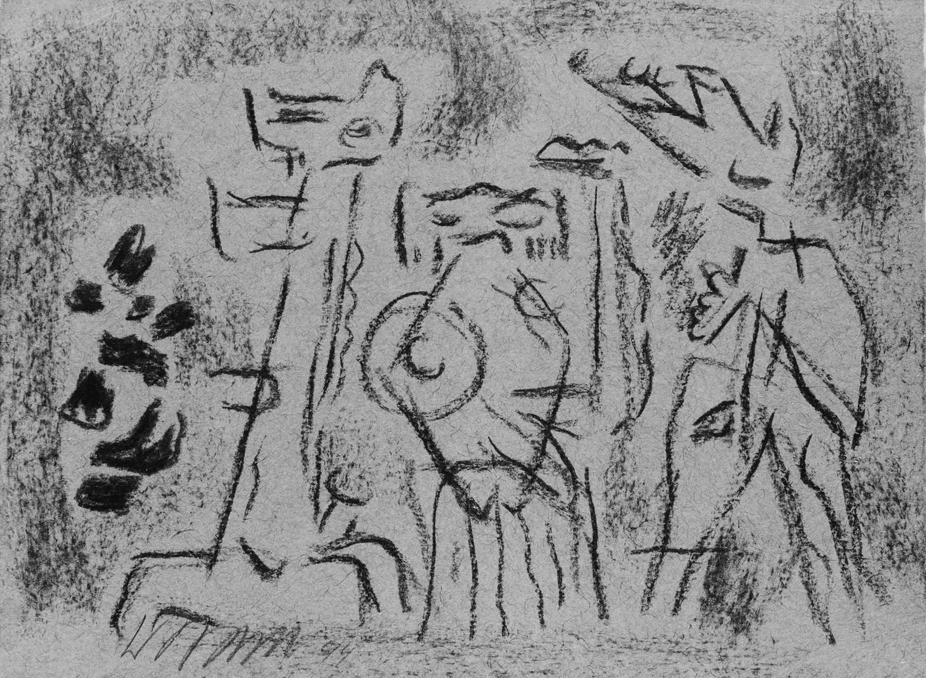 Kohle, z. T. gewischt, fixiert, auf türkisfarbigem Bütten (Vorsatzpapier) mit Wz. l. o.: Rosette (angeschnitten)