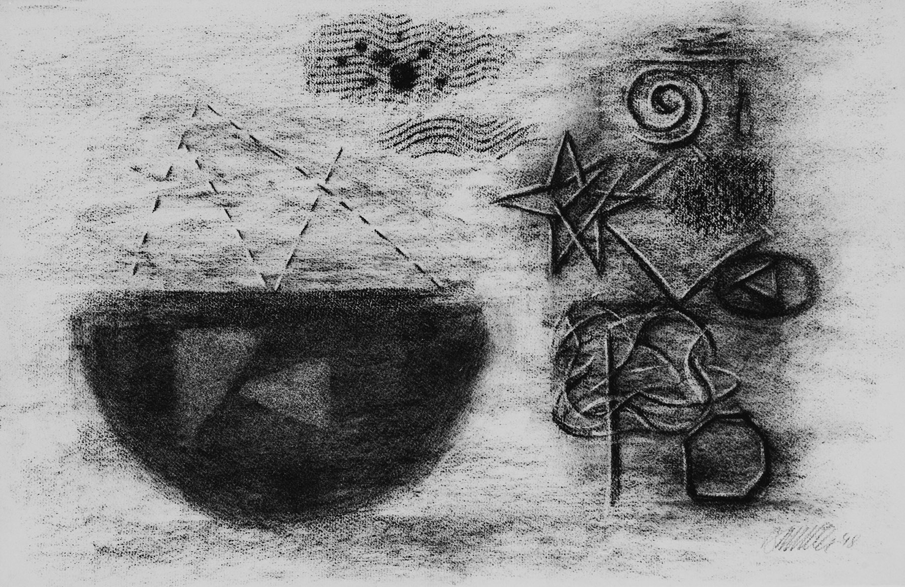 Kohle, gewischt, radiert, Ölkreide in Schwarz, durchgerieben, fixiert, auf chamoisfarbigem Ingres-Bütten mit Wz. r. u.: Kartusche und l. o.: ...NTGOLFIER FRANCE