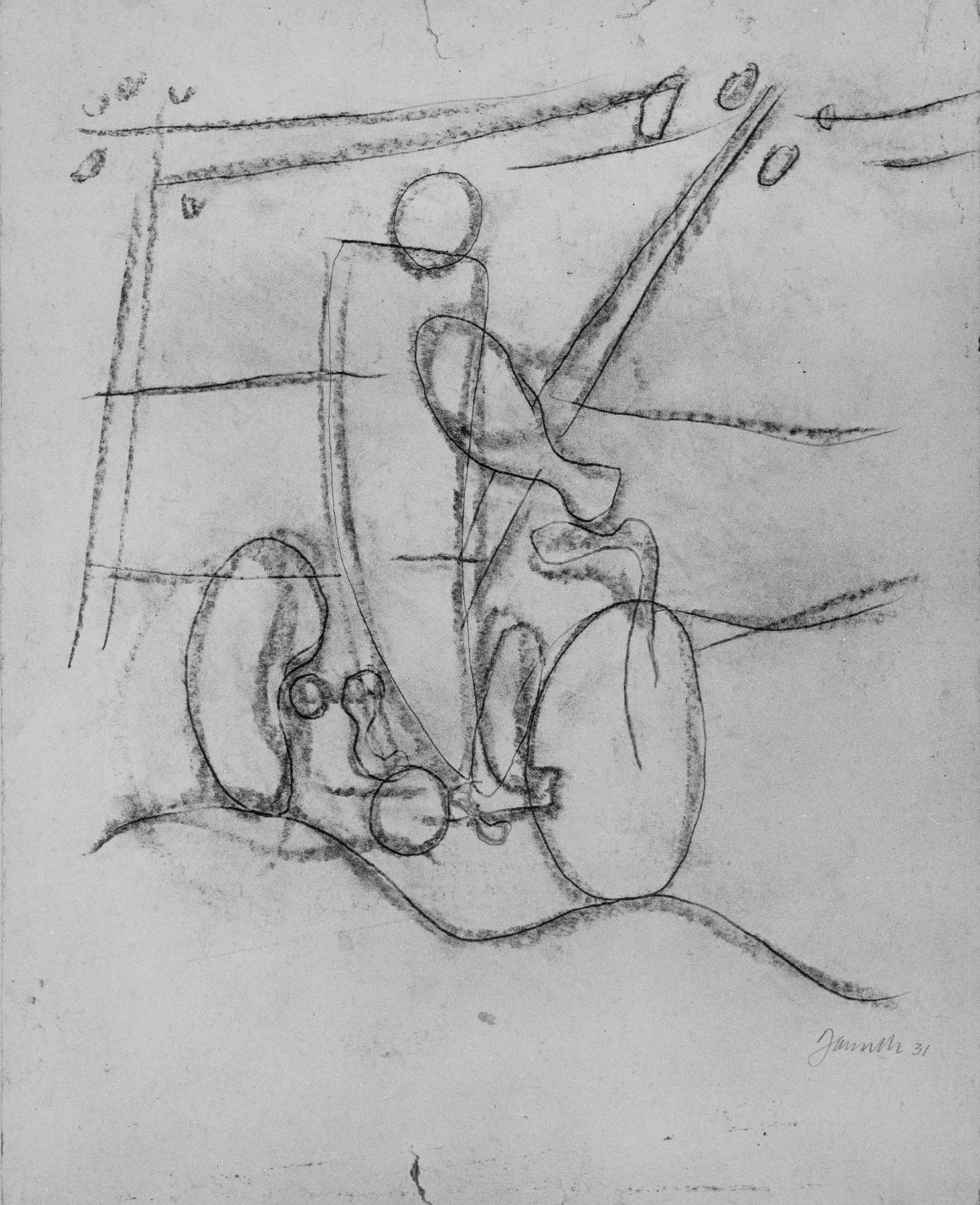 Bleistift, Kohle, fixiert, Konturen tief eingedrückt mit unterschiedlicher Schwärze auf chamoisfarbigem Aquarellkarton